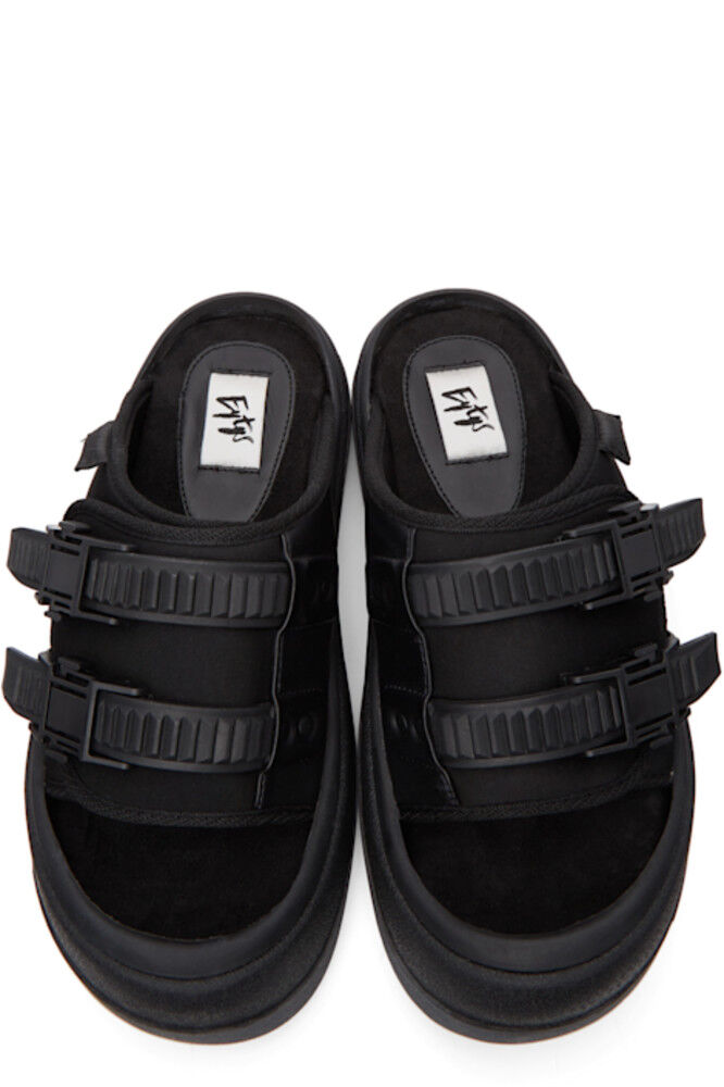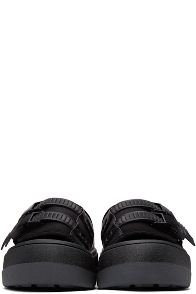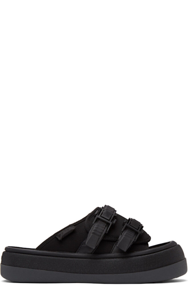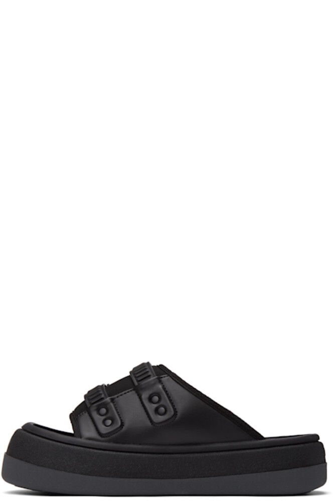 Сандалии из полированной искусственной кожи и неопрена черного цвета. Открытый круглый носок. Двойные регулируемые прорезиненные ремешки с застежкой-застежкой и текстильным логотипом на мыске. Текстильная нашивка с логотипом белого цвета на стельке из искусственной замши. Тональная текстурированная резиновая подошва с тисненым логотипом на пятке. Резиновая подошва с протектором серого цвета. Доступно эксклюзивно в SSENSE.