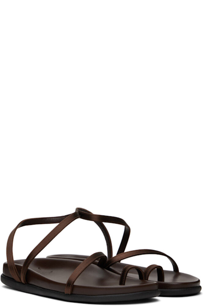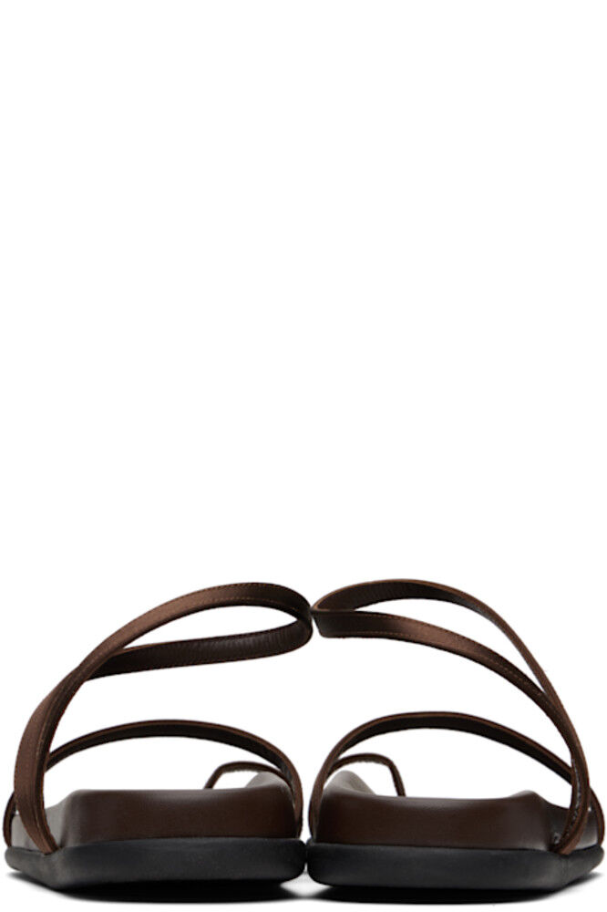 Сандалии ручной работы из атласа на плоской подошве коричневого цвета.