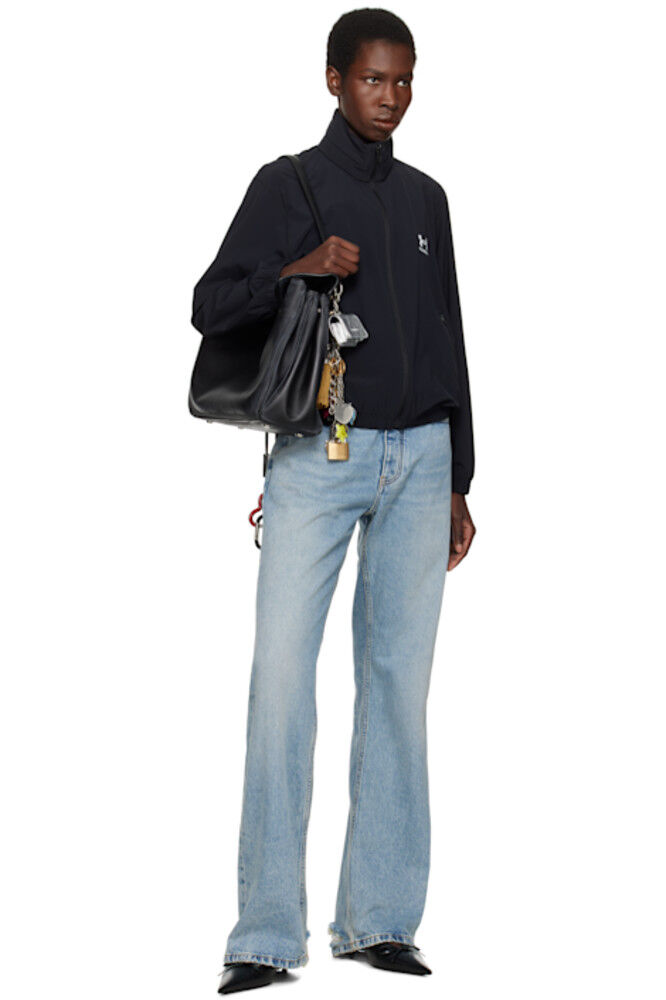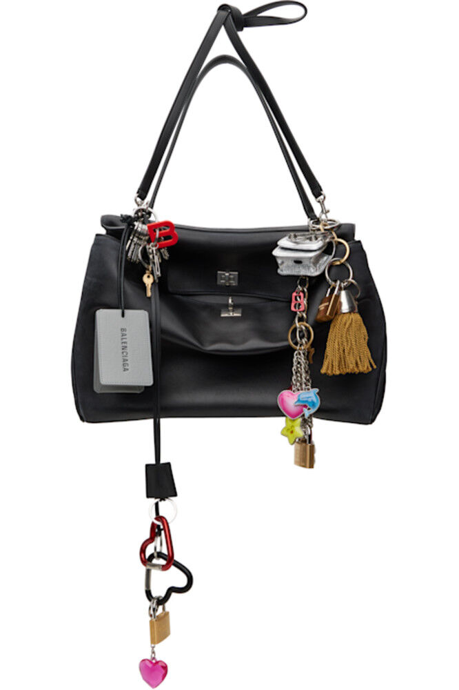 Сумка из гладкой телячьей кожи с верхней ручкой черного цвета. · Съемные подвески и брелки с выгравированным логотипом · Потертости и выцветание по всей поверхности · Съемные обтянутые чехлом брелоки на плечевом ремне · Съемный ремень через плечо · Застежки на кнопках по бокам · Накладные карманы на задней стороне · Кнопки-амортизаторы у основания · Застежка на поворотный замок · Карман на молнии внутри с двумя отделениями · Подкладка из кожи ягненка наппа · Фурнитура цвета состаренного серебра с выгравированным логотипом · В11,75" x Ш15,75" x Г5"