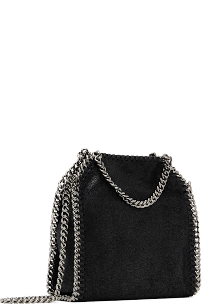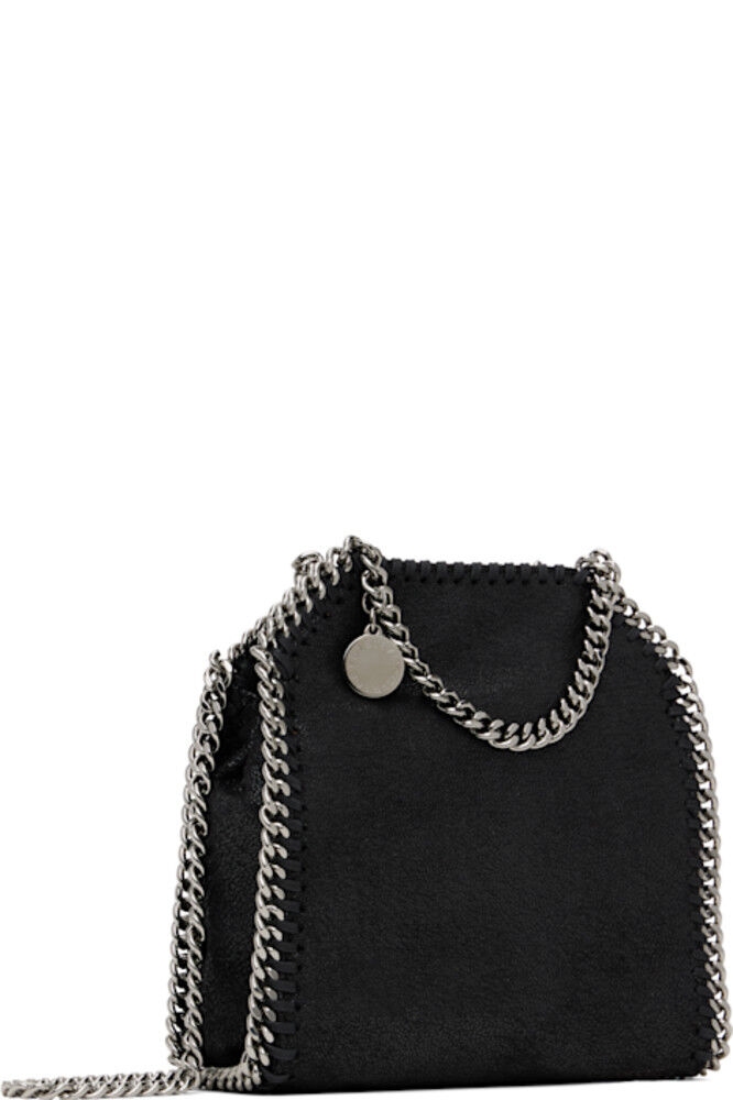 Сумка через плечо из искусственной замши черного цвета. Прострочка из органического хлопка, сертифицированная GOTS, и отделка панцирной цепочкой по всей длине. · Ручки для переноски из панцирной цепи · Диск с логотипом на ручке для переноски · Ремень через плечо из панцирной цепи · Застежка на магнитной кнопке · Накладной карман внутри · Подкладка из атласа с логотипом · Фурнитура серебристого цвета · В7,5" x Ш7" x Г2,5" Изготовлено из материалов, не тестируемых на животных.