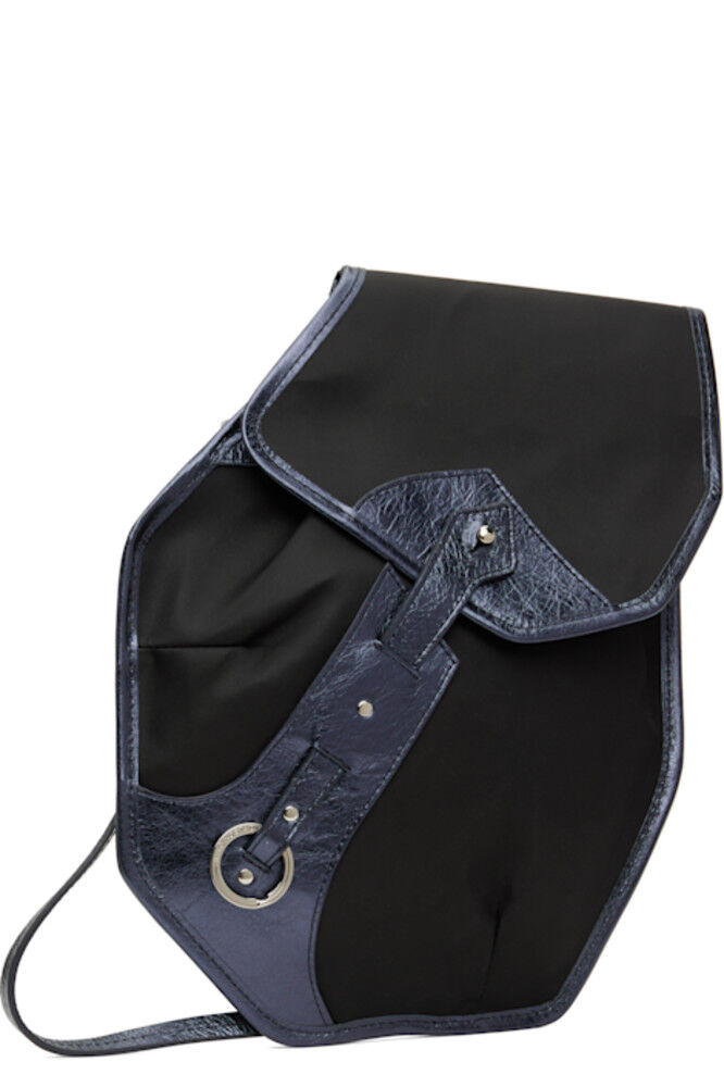 Сумка-мессенджер из зернистой телячьей кожи и нейлоновой тафты черного и металлического синего цветов.