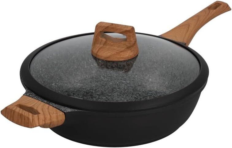 Высокоэффективное Наше кремовое керамическое мраморное покрытие устанавливает стандарты в отношении антипригарных свойств, стойкости к истиранию и защиты от коррозии. Для здорового образа жизни без масла. Стейки, яйца, лосось - все будет скользить как шелк на вашей тарелке. Особенно прочное благодаря стойкости к истиранию и царапинам. Толстое покрытие служит дольше, чем любое антипригарное покрытие, которое вы пробовали раньше. При этом оно легкое для удобства в обращении.