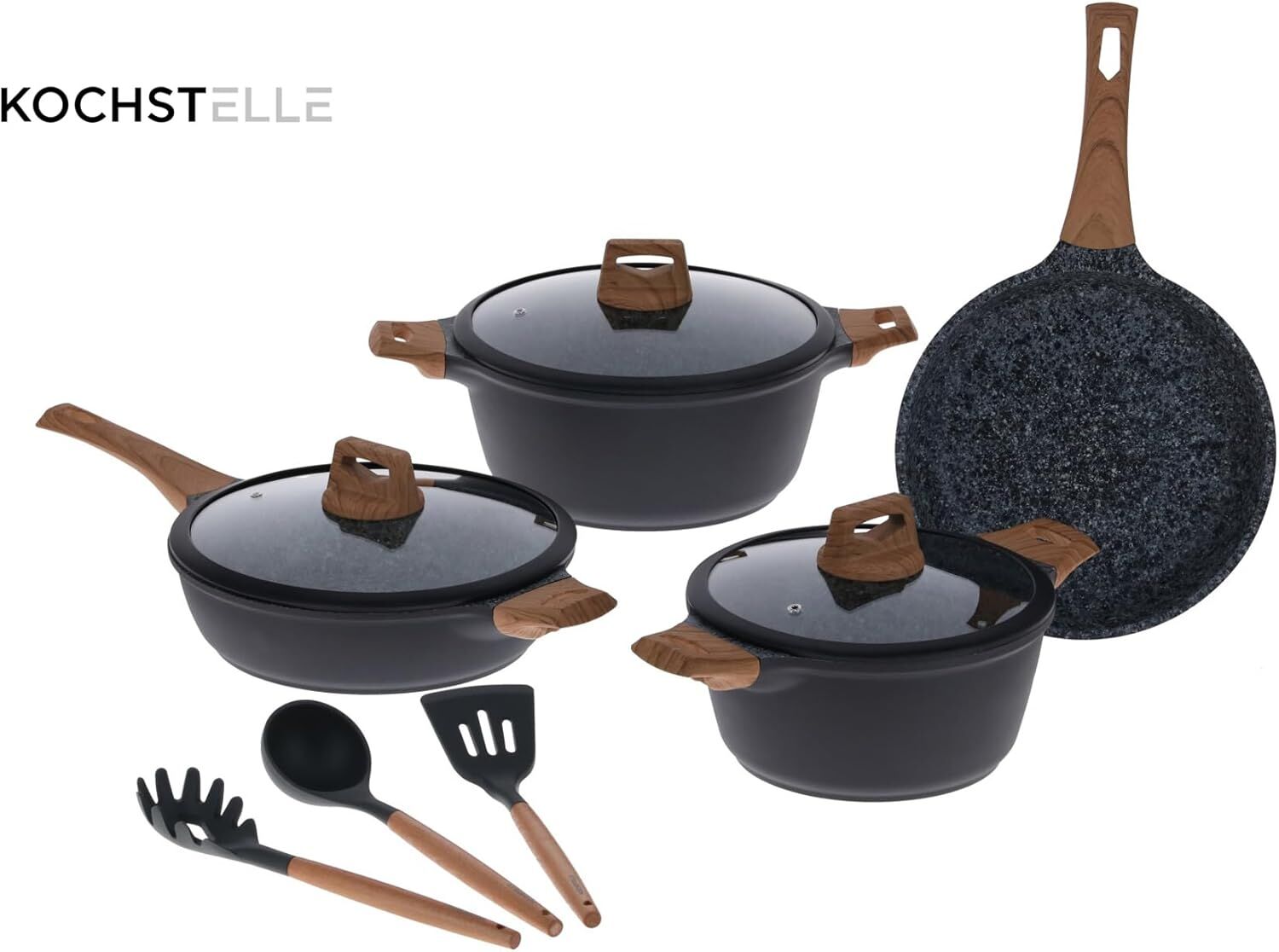 Набор гранитной посуды Kochstelle из 10 предметов. В комплект входит: кастрюля 24 см и 28 см с крышкой, сковорода 28 см с крышкой и сковорода 26 см + 3 кухонных прибора с силиконовыми и деревянными ручками.