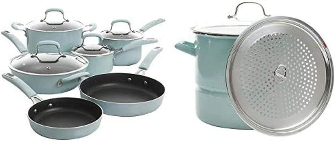 Вместе с красивым внешним покрытием цвета голубой эмали ледника и высококачественным кованым алюминием большой толщины этот набор обеспечивает быстрый равномерный нагрев и точность работы. Ненагревающиеся ручки с двойными заклепками сконструированы так, чтобы быть термостойкими. Набор можно использовать в духовке при температуре до 350 ° F. Наслаждайтесь красивыми формами, которые легко складывать и экономят место в шкафах.