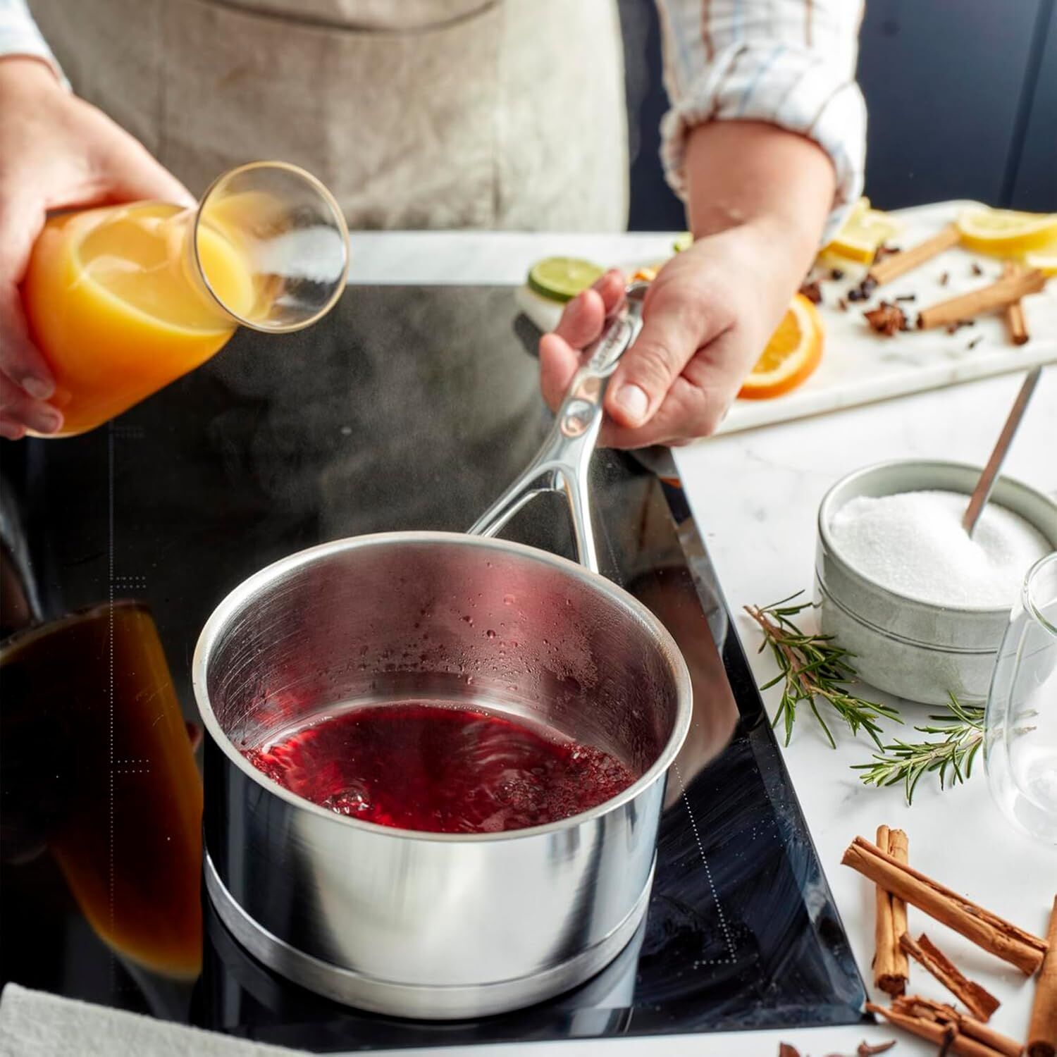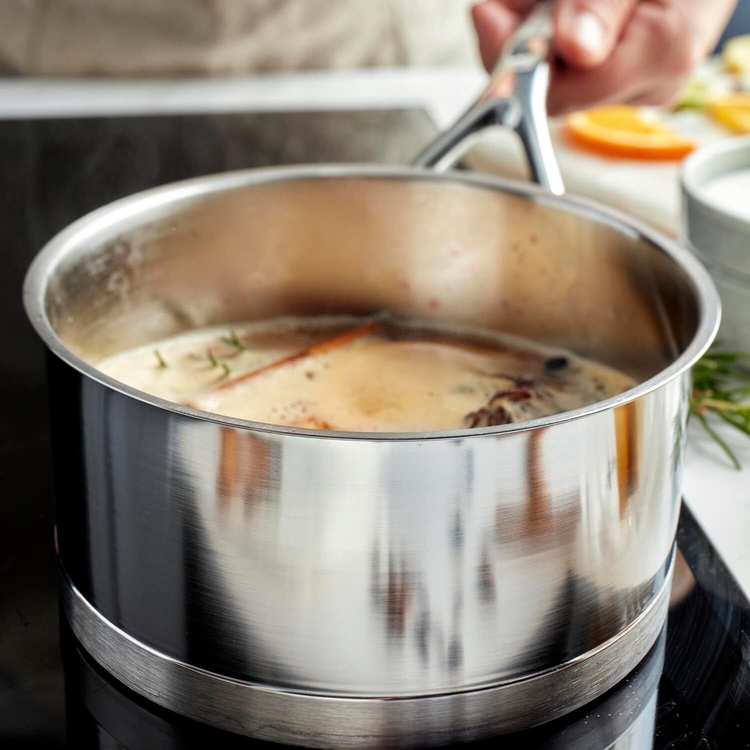 Классическая кастрюля объемом 3,2 кварты с прямыми стенками, изготовленная из нержавеющей стали и имеющая 7-слойное дно для оптимального распределения тепла.