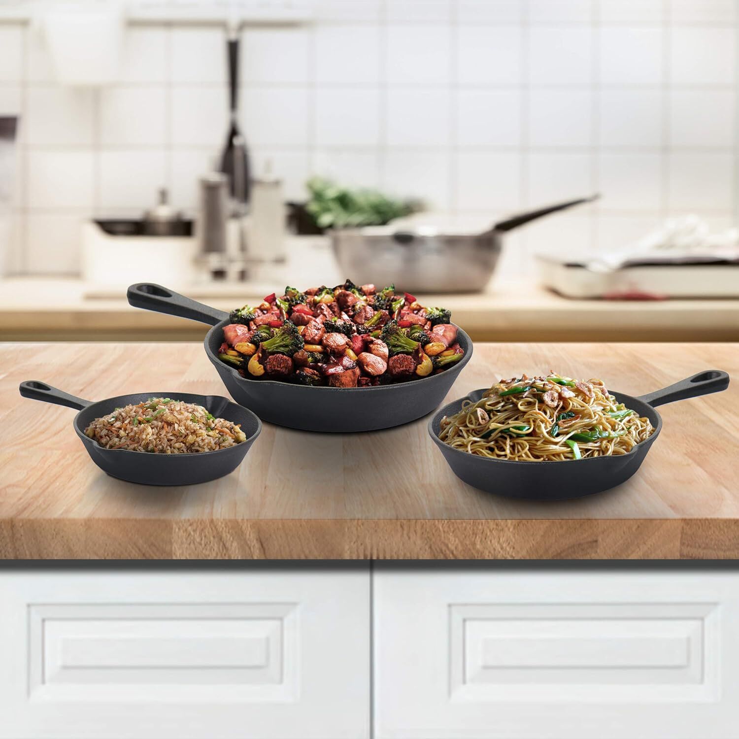 Набор из 3 чугунных сковород MegaChef идеально подходит для обжаривания, обжаривания, жарки на сковороде, выпечки, жарки на гриле и запекания всех ваших любимых блюд. Благодаря долговечности и универсальности чугунные сковороды сочетают в себе богатое наследие с современными потребностями. Предлагая более здоровую альтернативу антипригарным сковородам, чугун равномерно распределяет тепло для более ароматного обеда. Эта кухонная утварь также легко перемещается из холодильника на плиту или из духовки на стол для легкой подачи.