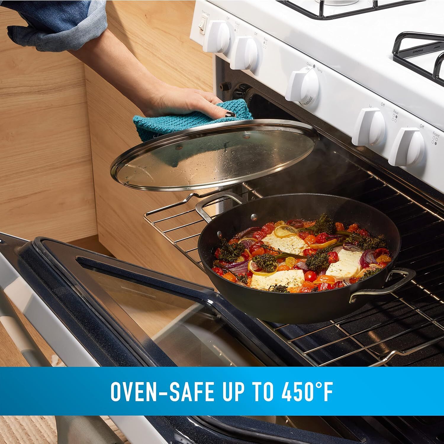 Крышки из закаленного стекла и прочная конструкция с твердым анодированным покрытием легко переходят от плиты к духовке, при температуре до 450 градусов по Фаренгейту.
