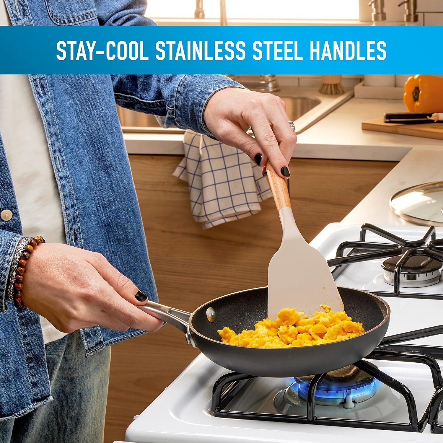 Длинные ручки из нержавеющей стали на сковороде остаются прохладными на плите, их легко поднимать и безопасно помещать еду в духовку.