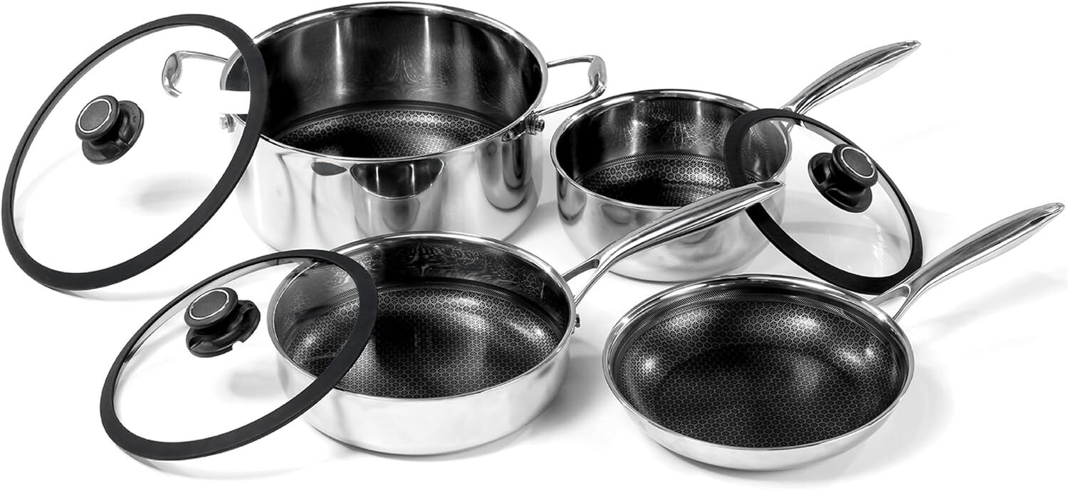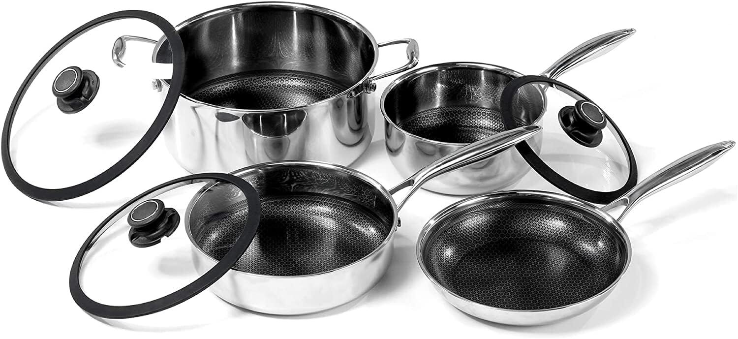Набор посуды Black Cube Quick Release включает в себя следующее: сковорода для жарки 24 см, кастрюля с крышкой на 2400 мл, сотейник с крышкой на 24 см, кастрюля с крышкой на 7100 мл. С посудой Black Cube Quick Release ваша еда готовится на рельефных пикселях из нержавеющей стали, а углубленный слой антипригарного покрытия облегчает очистку. Покрытие без ПФОК на 100% устойчиво к царапинам и безопасно для использования с металлической посудой. Можно использовать на всех варочных панелях, включая индукционные и безопасные для духовки при температуре до 500 °F.