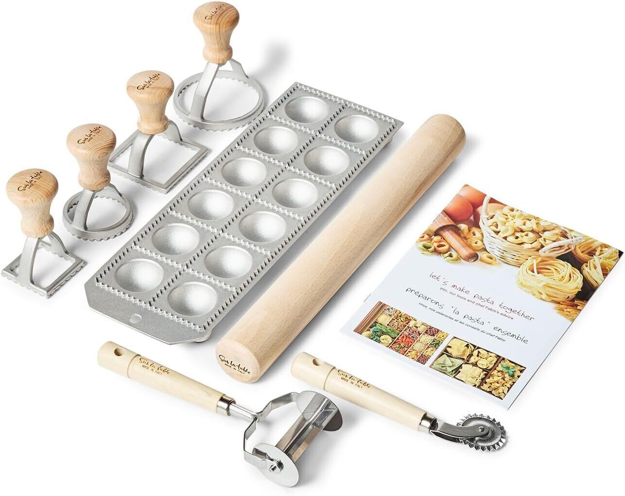В наш набор входит таблетка для равиоли, скалка, два квадратных штампа, два круглых штампа, резак для пасты и колесо для теста, так что вы можете начать прямо сейчас!.