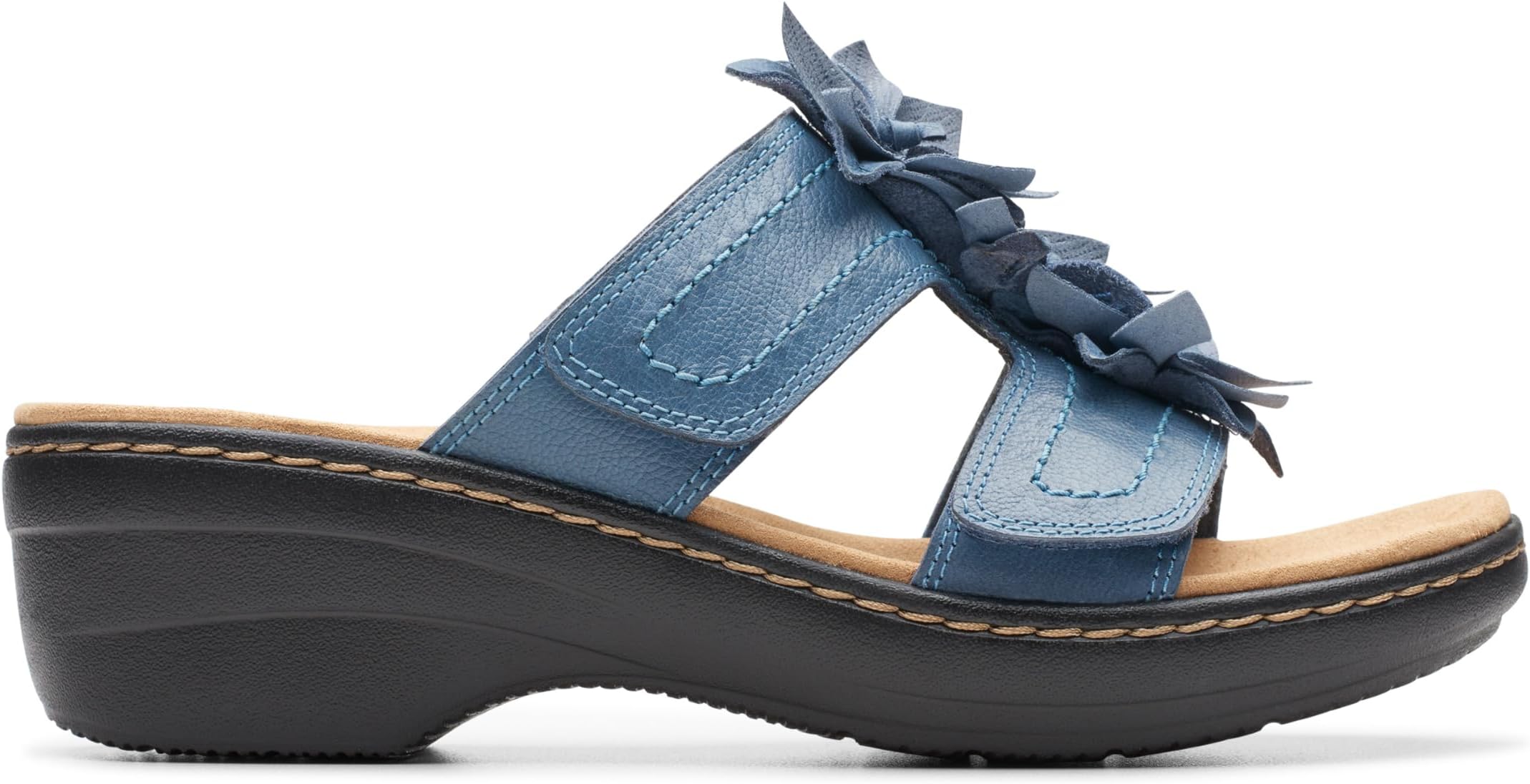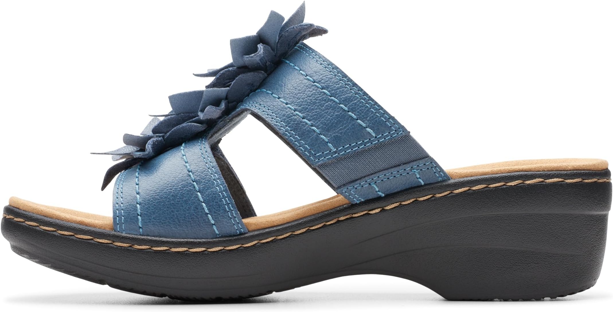 Будьте изысканны с головы до ног, сочетая свое элегантное платье с удобными платьями Clarks Merliah Raelyn. Эта пара сандалий, изготовленных из кожаного верха, синтетической подкладки и комфортной поролоновой стельки, украшена цветочными деталями на верху, открытым круглым носком, застежкой на ремешок с крючком и петлей и танкеткой на каблуке.