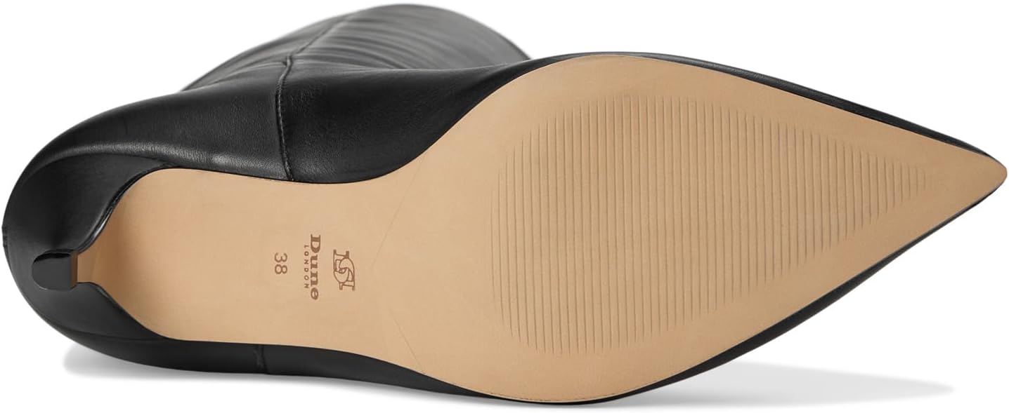 Высокая голенище гладких ботинок Dune London дополнено массивным каблуком "котенок", демонстрирующим уравновешенное совершенство. Силуэт с заостренным носком, верх обуви до колена выполнен из кожи, что способствует легкому надеванию.