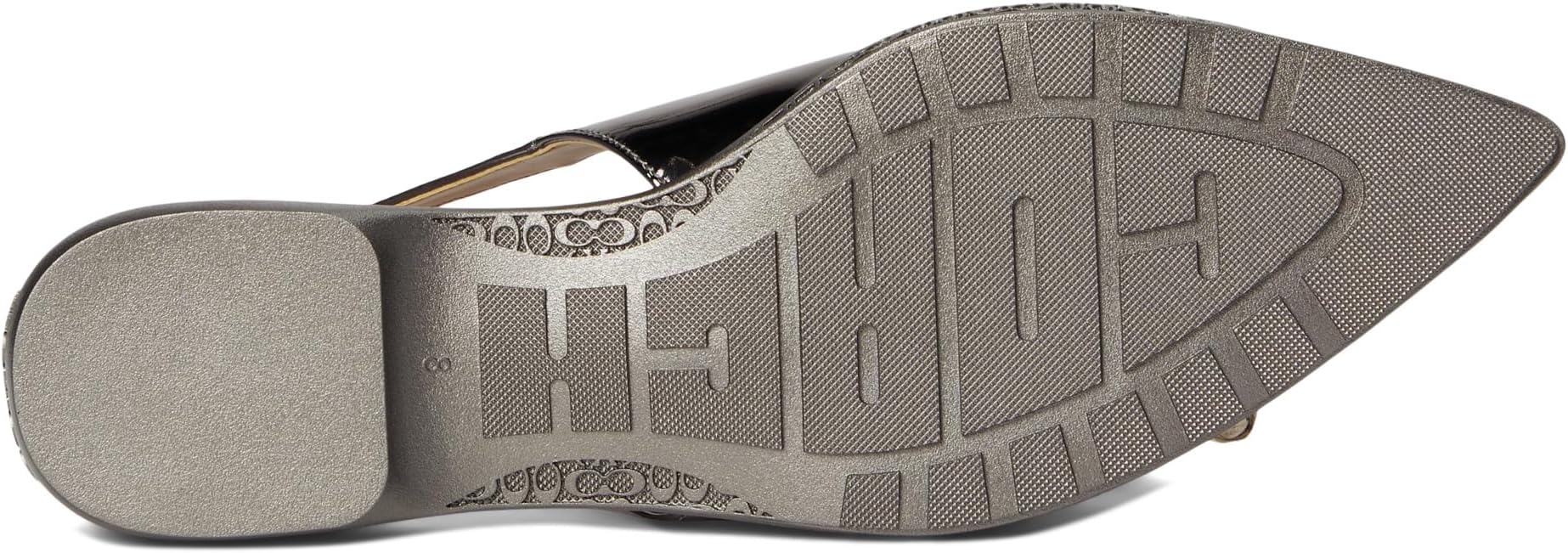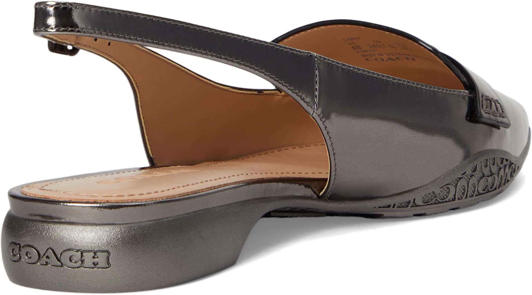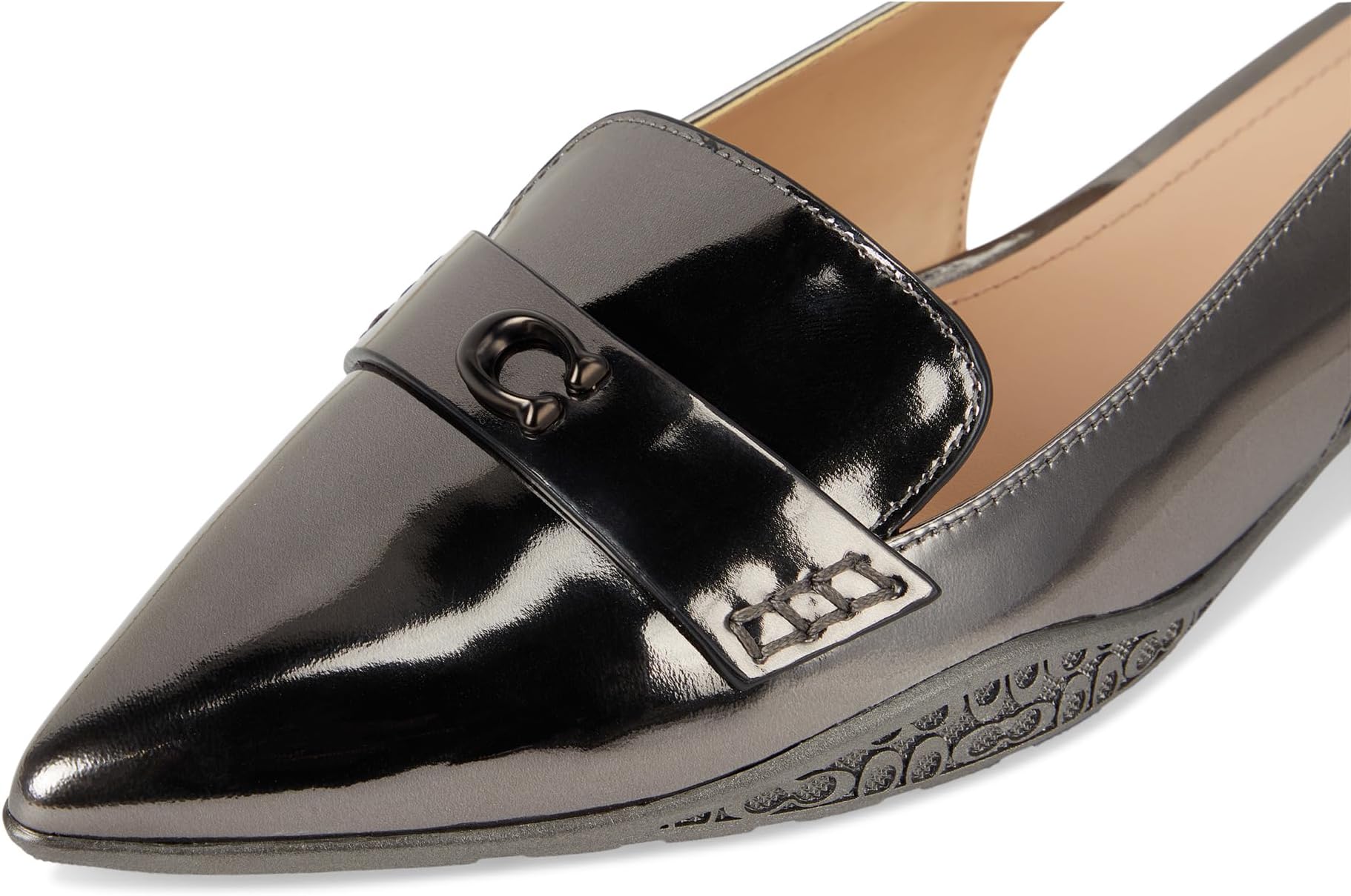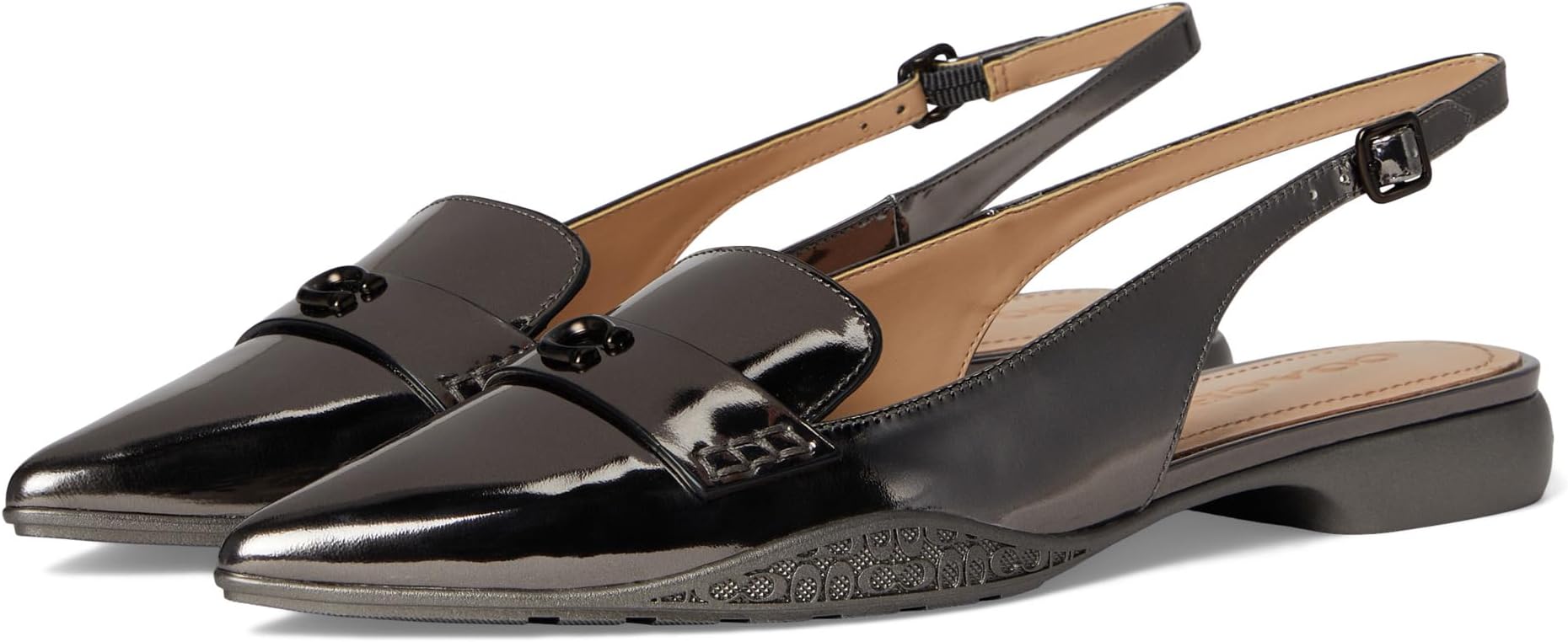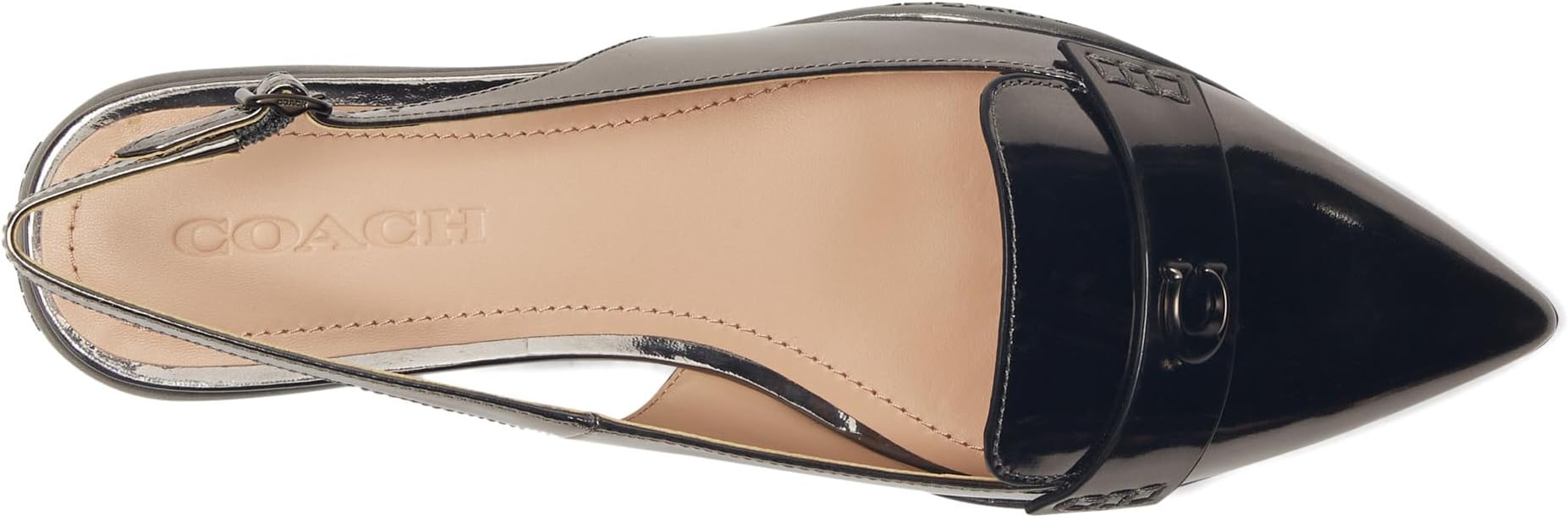 Идеально подходит для любого случая! Скиммер COACH Carrie из металлизированной кожи - обязательный элемент вашего шикарного гардероба. Модель с заостренным носком, регулируемым ремешком с пряжкой, фирменной фурнитурой в тон и мягкой кожаной стелькой для комфорта в течение всего дня.