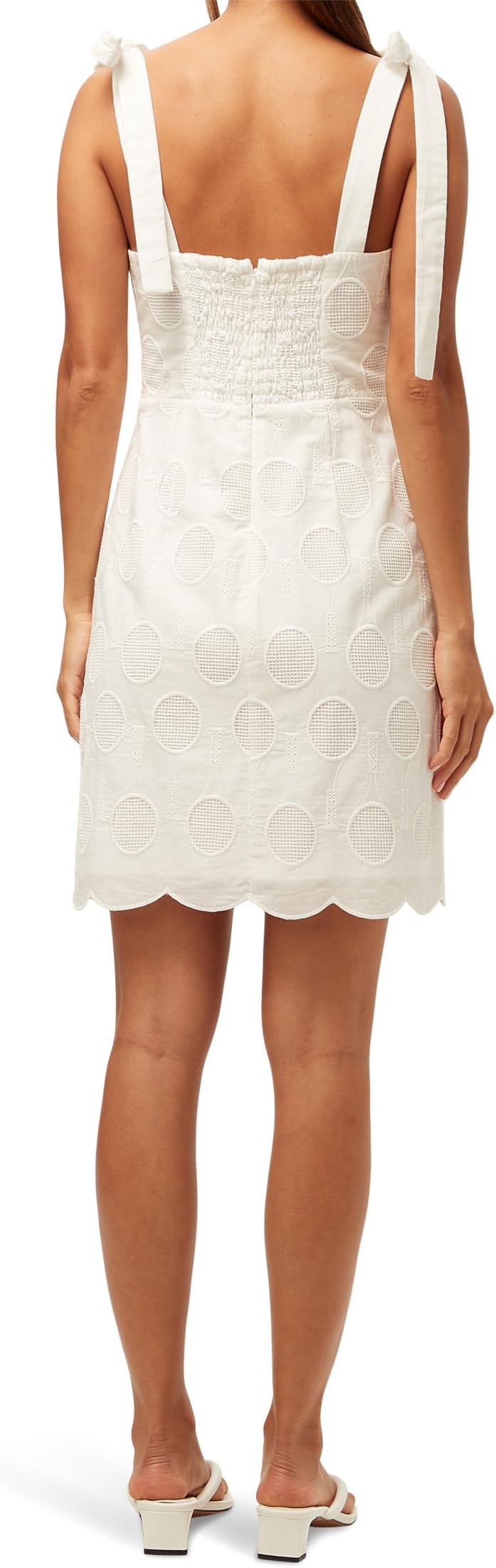 Воплощение очарования в модном платье Trina Turk Pyle - где игривость сочетается с изысканностью! Этот легкий силуэт А-силуэта выполнен из тонких теннисных петелек, добавляющих нотку спортивной изысканности в ваш гардероб. Фестончатый подол придает изделию кокетливый вид, а завязывающиеся бретельки с бантиками на плечах создают непринужденную атмосферу шика. Квадратный вырез и дизайн без рукавов придают ему легкость, идеально подходят для прогулок на солнце или вечеринок в саду. Это платье с застежкой на молнию сзади для удобства ношения сочетает в себе комфорт и стиль, что делает его идеальным выбором для любого случая, требующего элегантности с изюминкой!