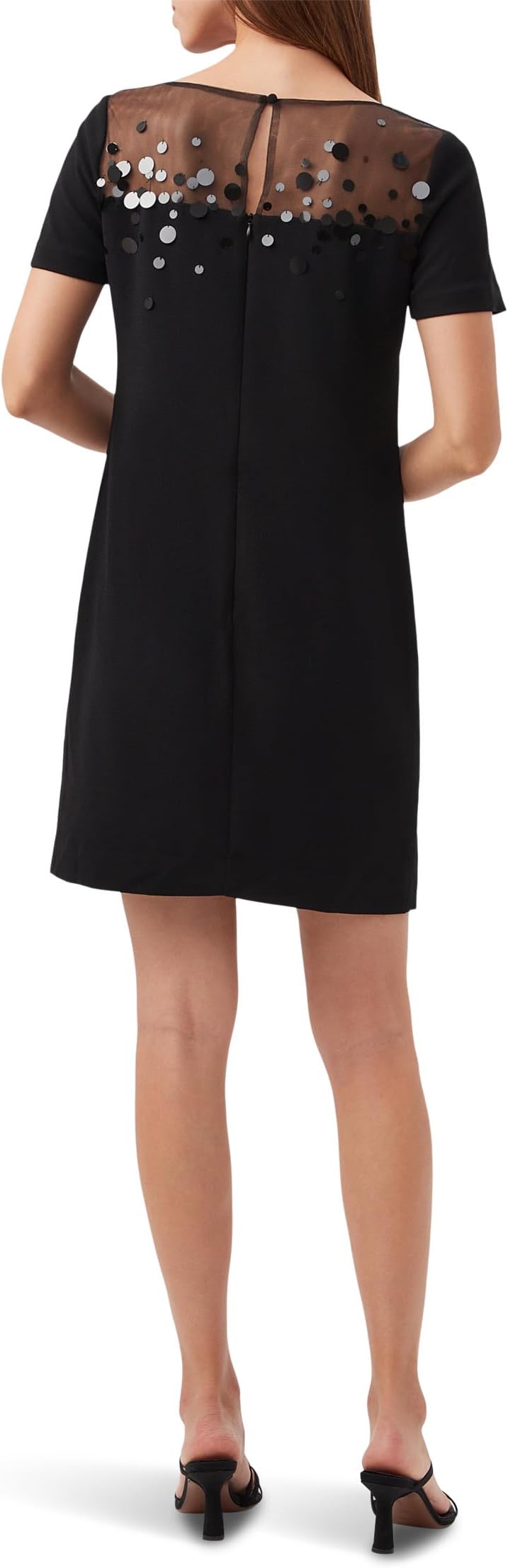 Платье Trina Turk Kittany искрится при каждом движении. Оно имеет округлый сетчатый вырез с украшениями и силуэт выше колена.