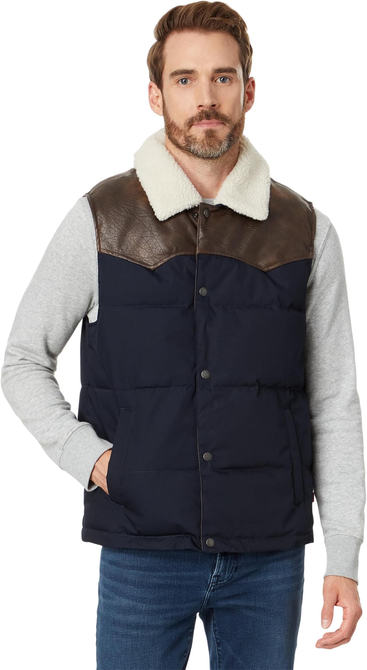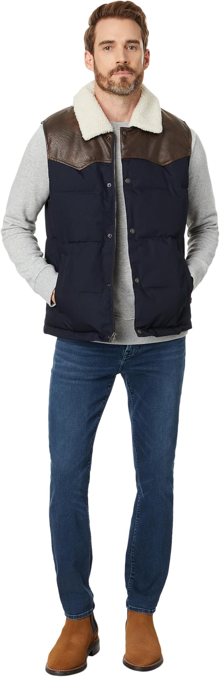 Жилет Levi's Out West, созданный для того, чтобы заявить о себе на любом общественном мероприятии, отличается стилем и комфортом. Стеганая куртка с отделкой из искусственной кожи сверху, с флисовым воротником, длинными рукавами, застежкой на молнию спереди и кнопками.