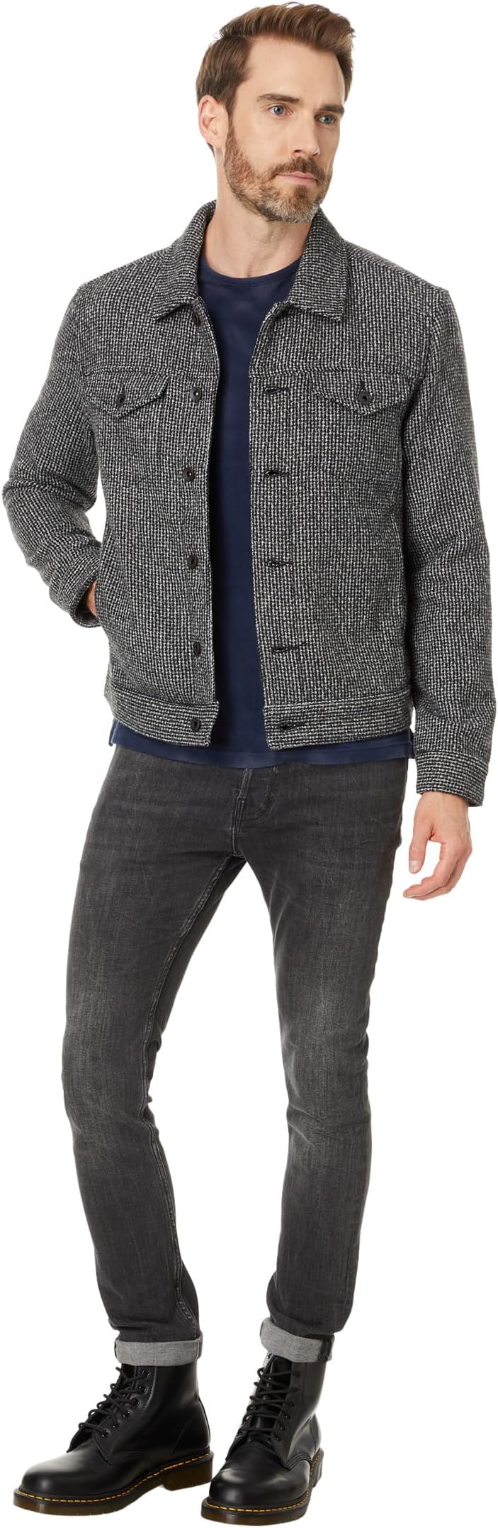 Куртка John Varvatos Evans O2125W24, сшитая из смесовой шерстяной ткани, имеет планку на пуговицах, придающую образу уравновешенности. Облегающее текстурированное пальто с отложным воротником, длинными рукавами с манжетами на пуговицах и двумя накладными карманами с клапанами на пуговицах на груди.