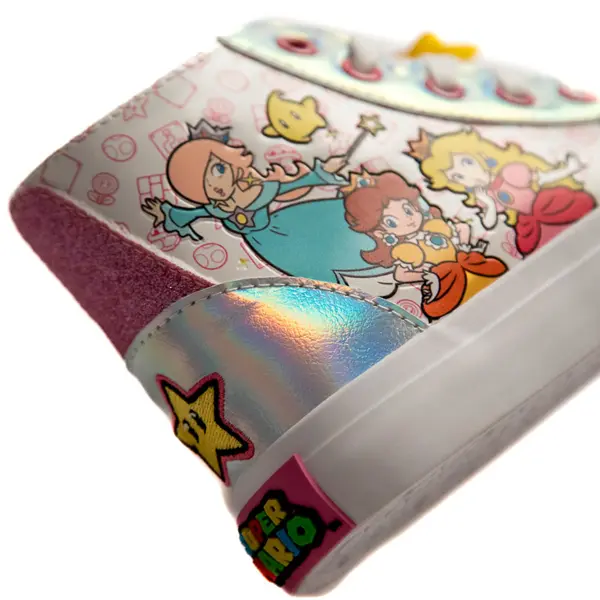 Конструкция с высоким верхом Прочный брезентовый верх с блестящими вставками для дополнительного блеска Все для Super Mario Bros. принт с изображением бонусов и предметов коллекционирования из классических видеоигр Декоративная графика на боковинах с изображением принцесс Розалины, Дейзи и Пич Мягкая текстильная подкладка с изображением Super Mario Bros. принт Серебристые металлические вставки на каблуке с ткаными нашивками Super Star для дополнительного блеска Кружевная застежка с подвесками Super Star обеспечивает надежную посадку Мягкая стелька обеспечивает длительный комфорт Прочная резиновая подошва обеспечивает гибкое сцепление