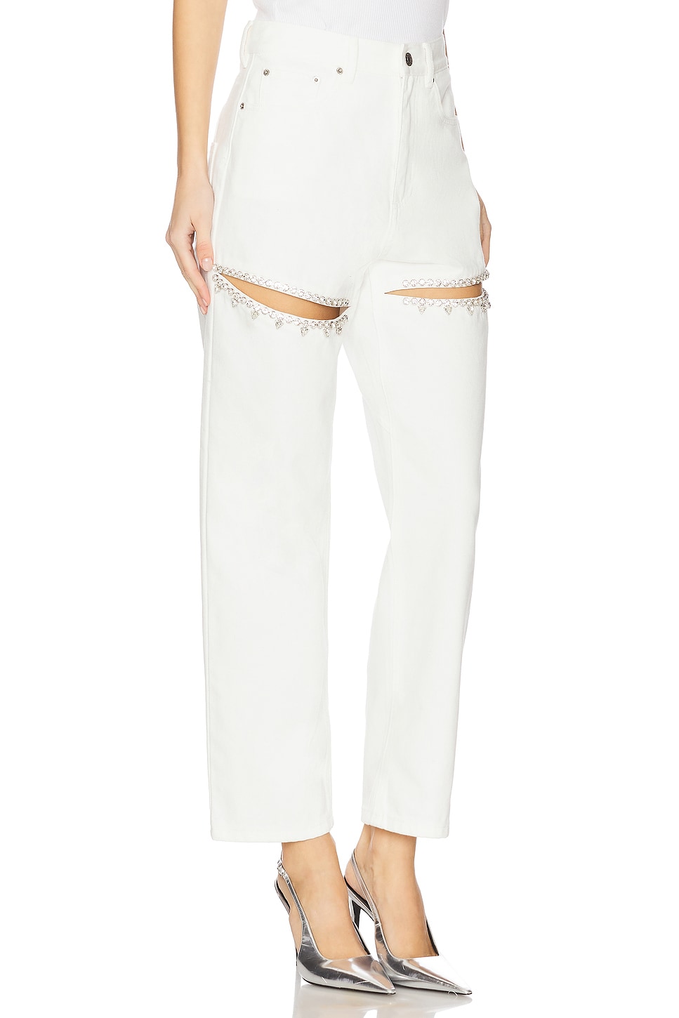 Пятикарманный фасон и вырезы спереди с отделкой стразами