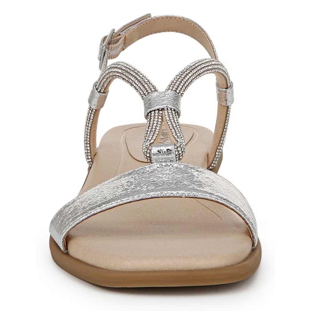 Добавьте немного блеска в эти женские сандалии на плоской подошве с ремешками и идеальными акцентами из стразов, которые идеально подходят как для повседневного, так и для повседневного образа. Женские сандалии с открытой пяткой, выполненные из искусственной кожи, с открытым квадратным носком, ремешком с регулируемой пряжкой и стразами. Подкладка изготовлена из частично переработанных материалов.