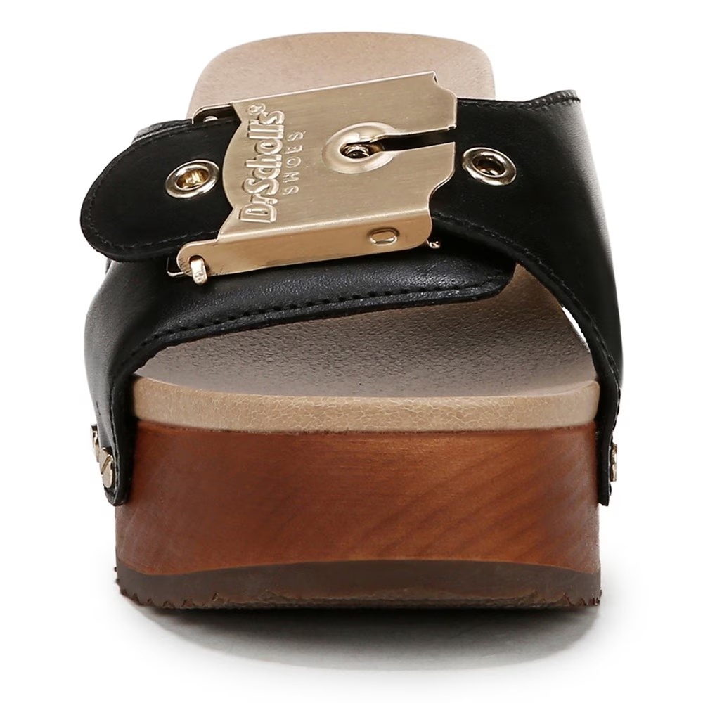 СТИЛЬ: Винтажные босоножки-башмаки на каблуке с крупной культовой пряжкой Dr. Scholl's, металлическими заклепками, открытым круглым носком и каблуком-платформой высотой 2 дюйма