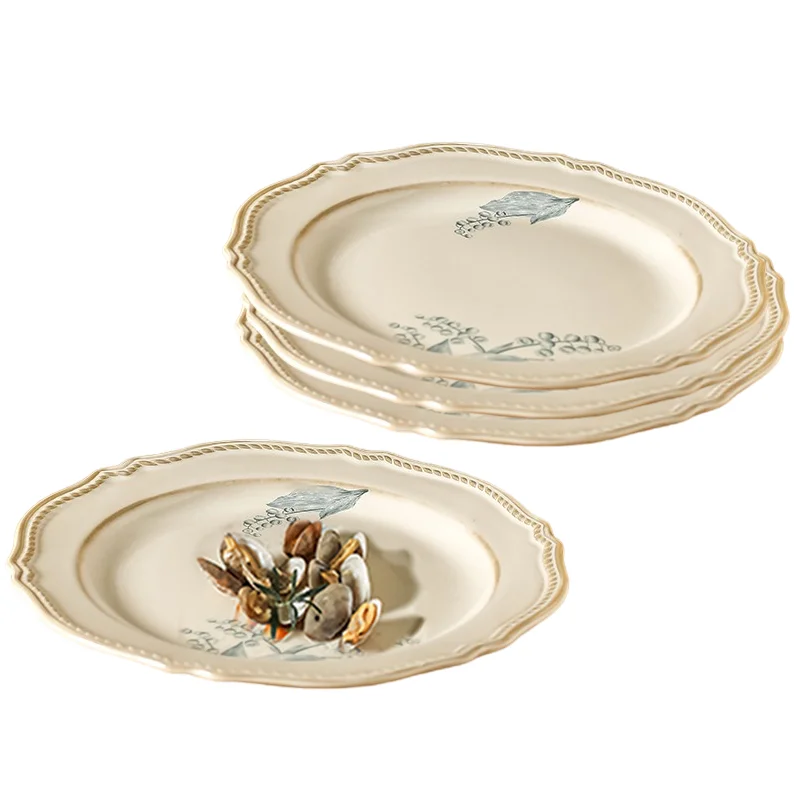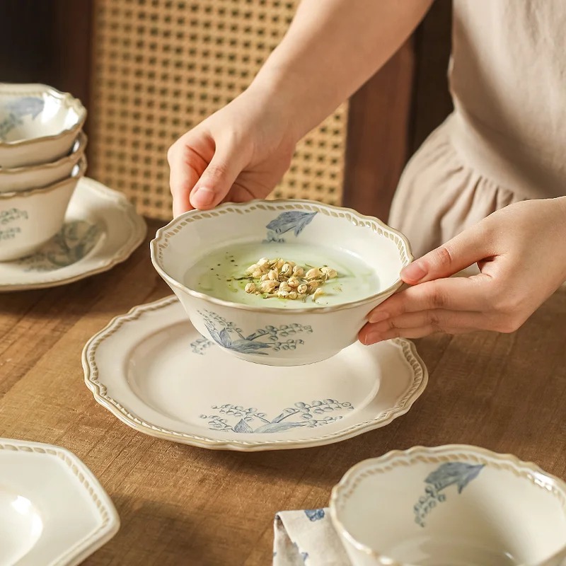 Тарелки пропитаны изысканностью и демонстрируют вкус и элегантность хозяйки. Все изделия украшают изящные, словно нарисованные акварелью, цветочные узоры на кремовом фоне, пронизанные духом романтики и ностальгии.