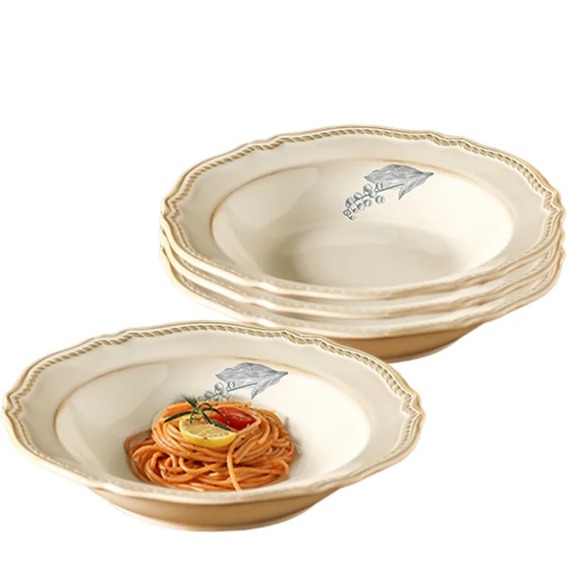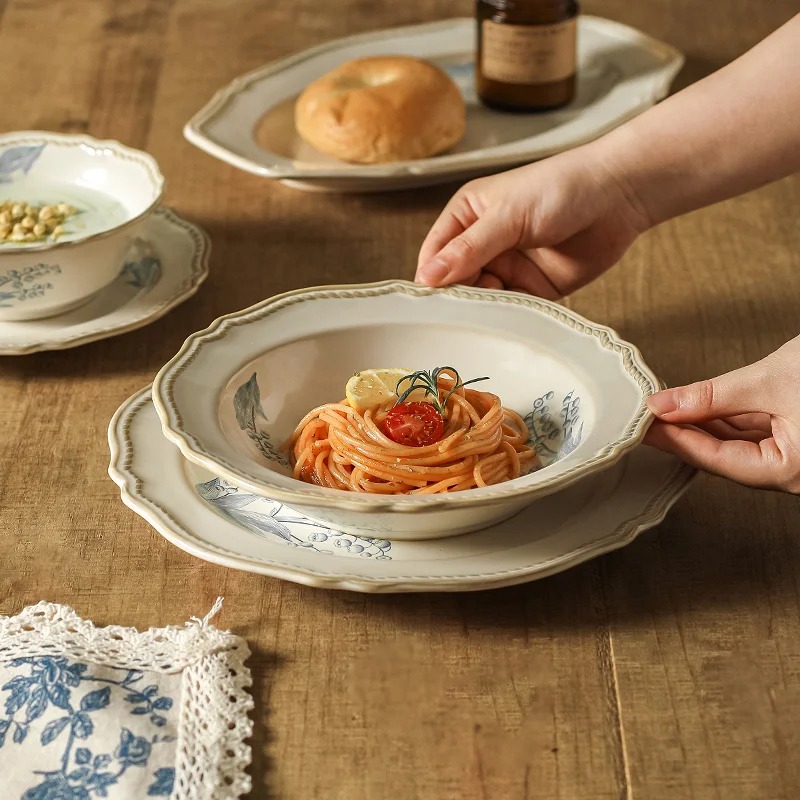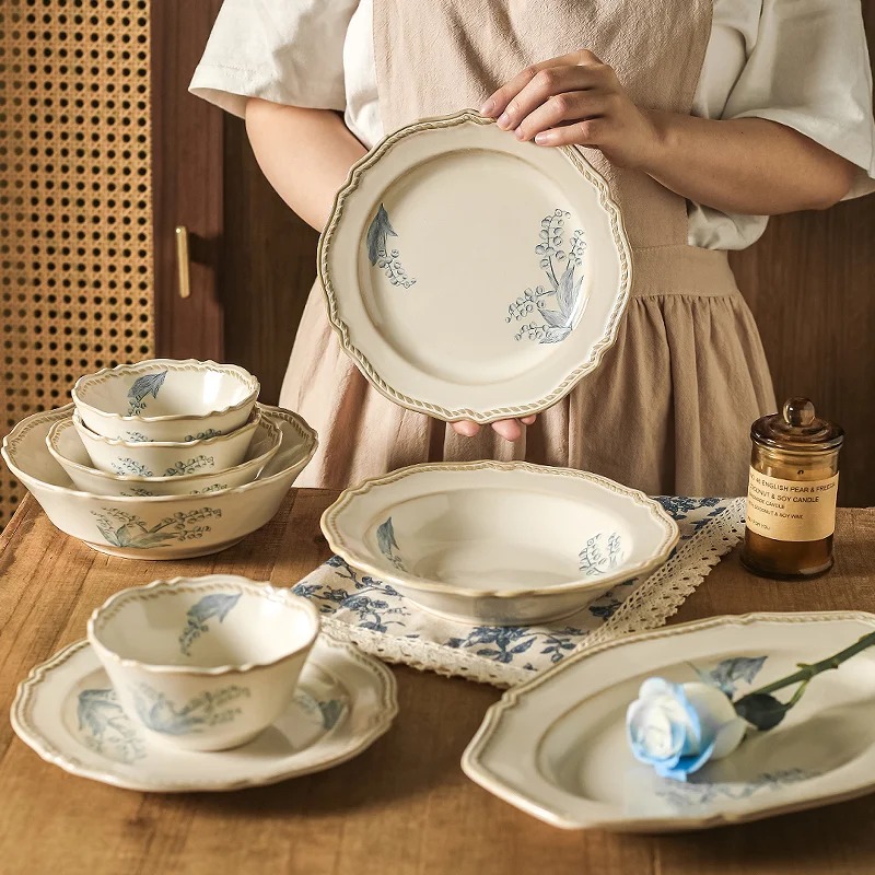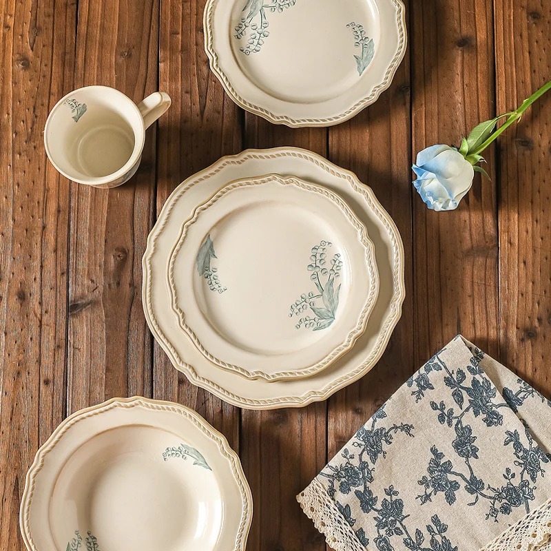 Тарелки пропитаны изысканностью и демонстрируют вкус и элегантность хозяйки. Все изделия украшают изящные, словно нарисованные акварелью, цветочные узоры на кремовом фоне, пронизанные духом романтики и ностальгии.