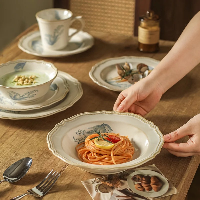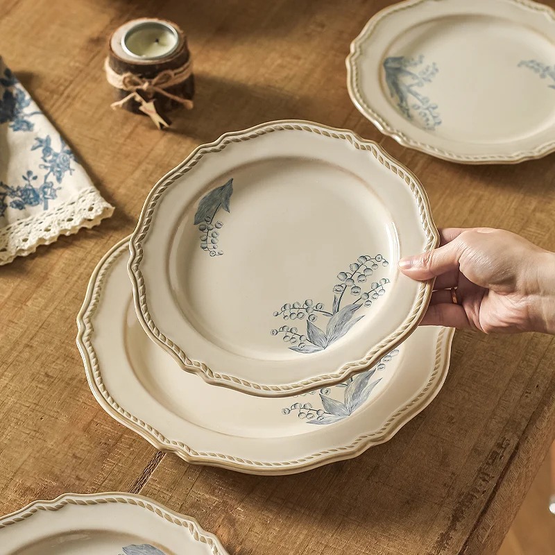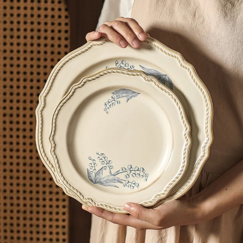 Тарелки пропитаны изысканностью и демонстрируют вкус и элегантность хозяйки. Все изделия украшают изящные, словно нарисованные акварелью, цветочные узоры на кремовом фоне, пронизанные духом романтики и ностальгии.