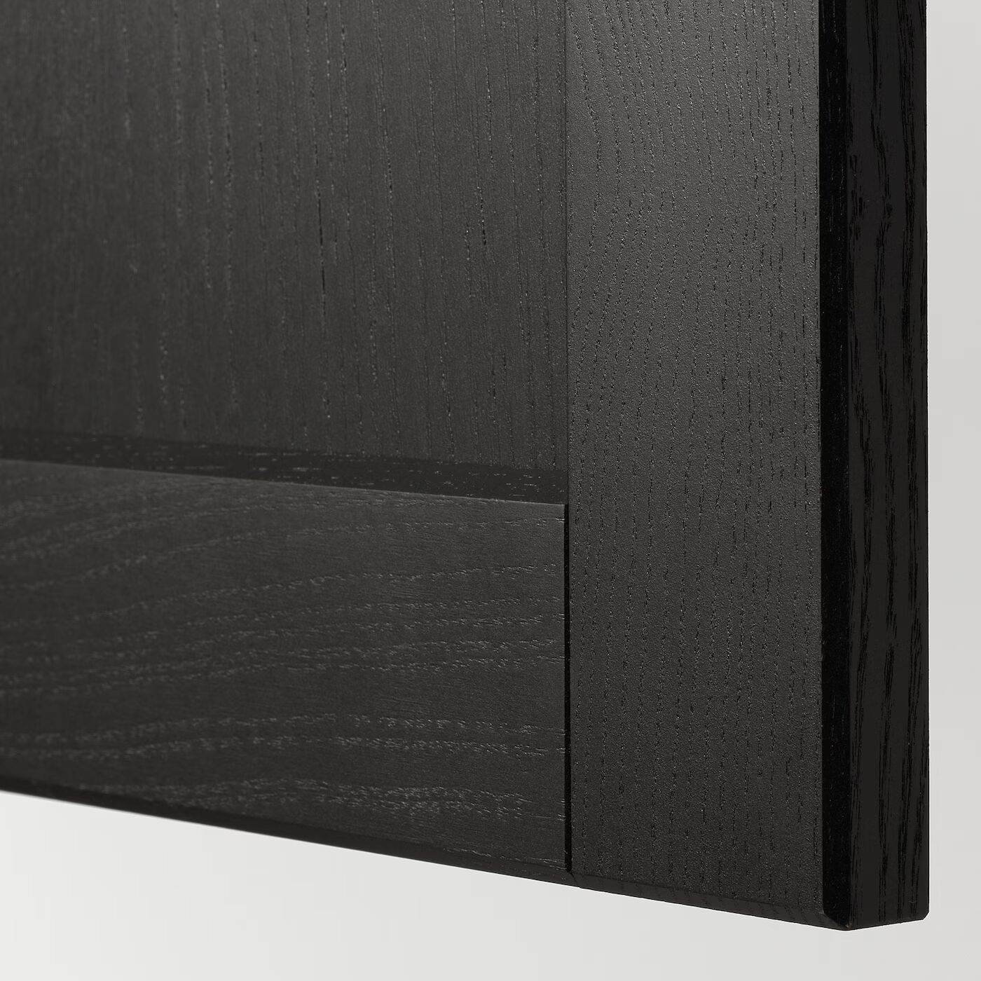 Прочная деревянная рама, скошенные края и обрамленные шпонированные панели придают кухонным фасадам LERHYTTAN вневременной и традиционный вид. Черная поверхность придает кухне теплый и сильный характер.