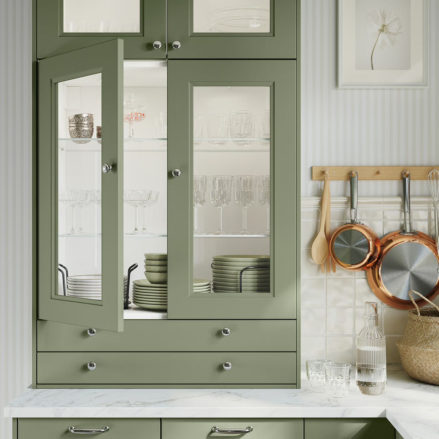 Стеклянные двери AXSTAD имеют матовую зелено-серую отделку с мягкими линиями и утопленными стеклянными панелями. Спокойный тон и традиционный дизайн привнесут спокойную, но выразительную атмосферу на вашу кухню.
