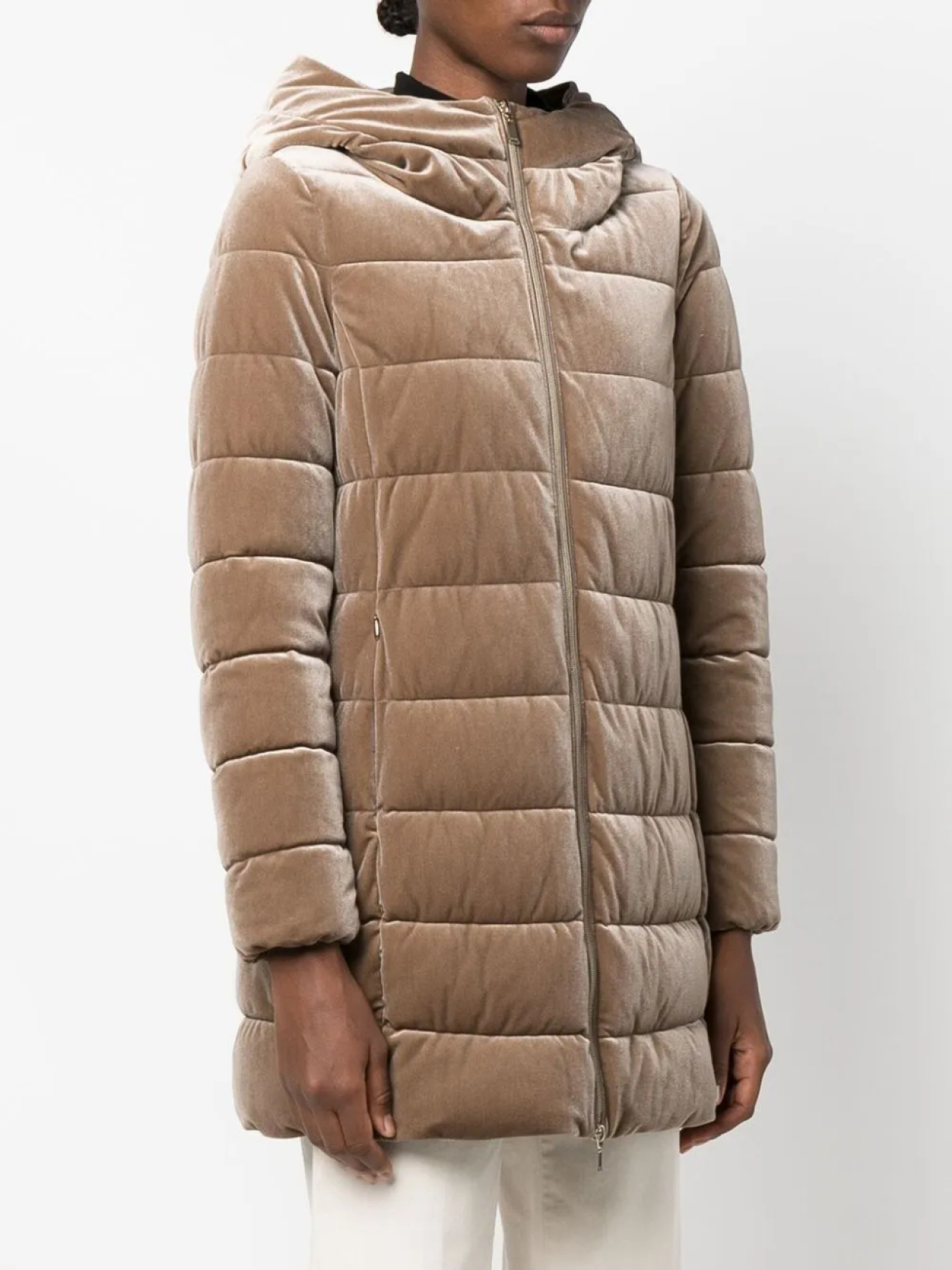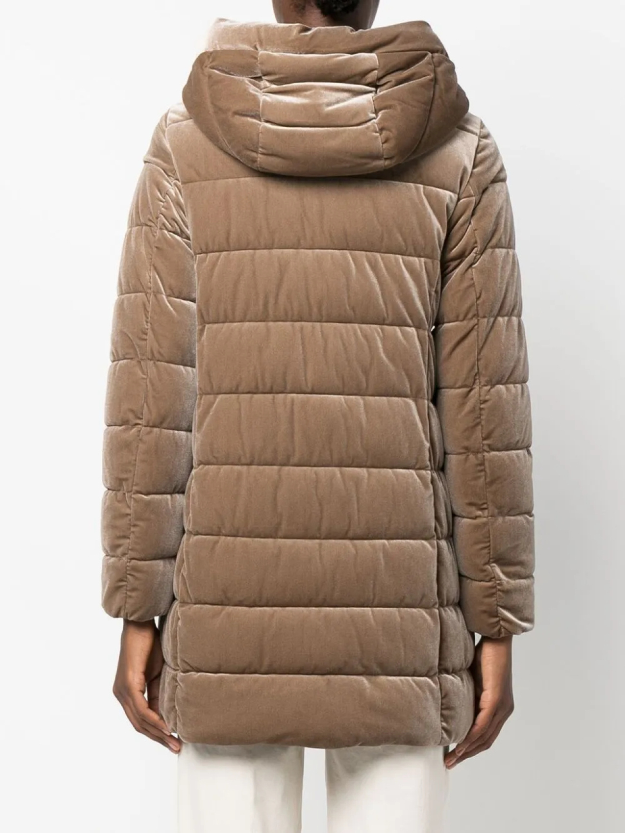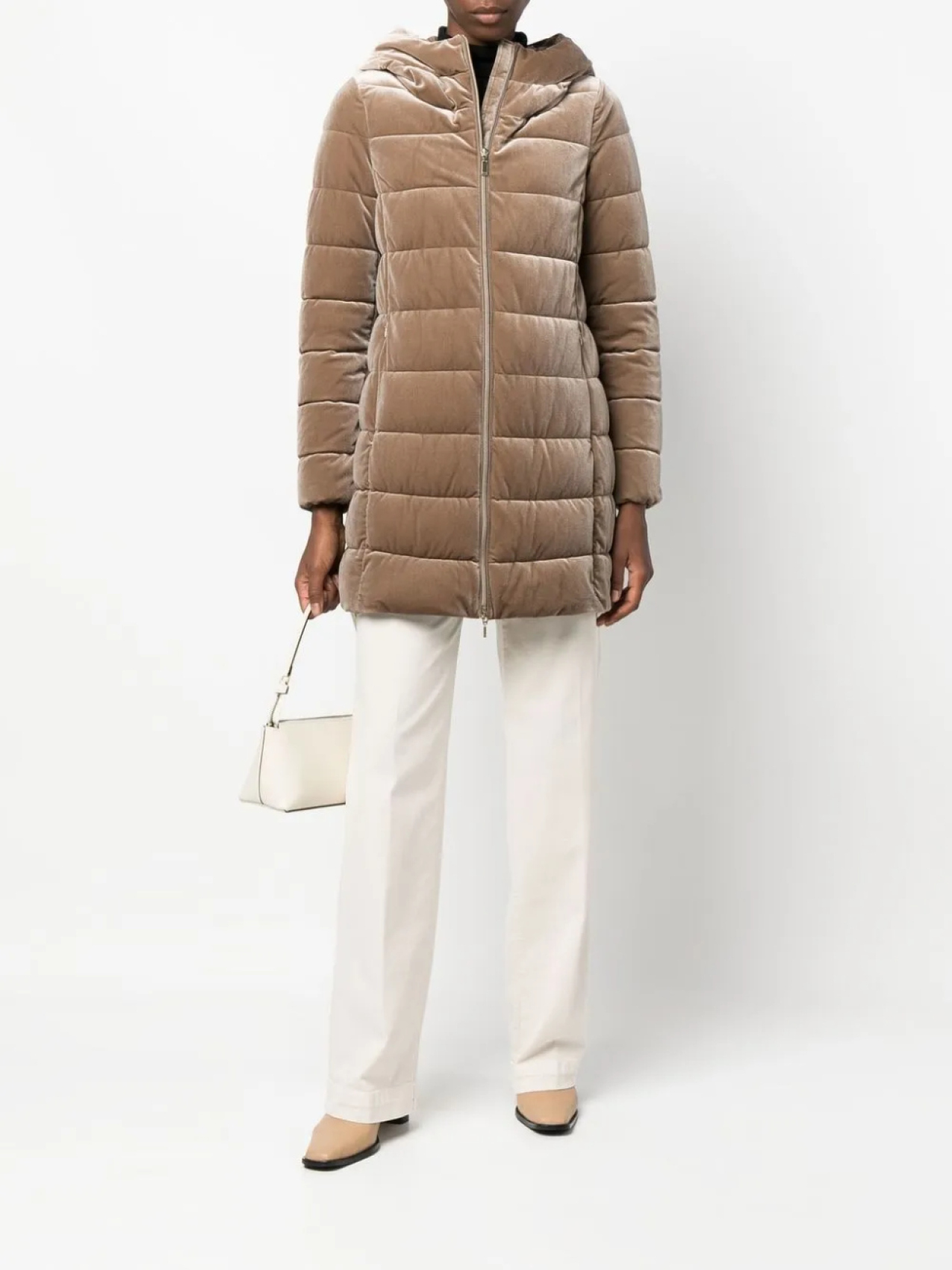 Коричневый, бархатный эффект, дутый материал, классический капюшон, длинные рукава, длина миди и застежка на молнии спереди.