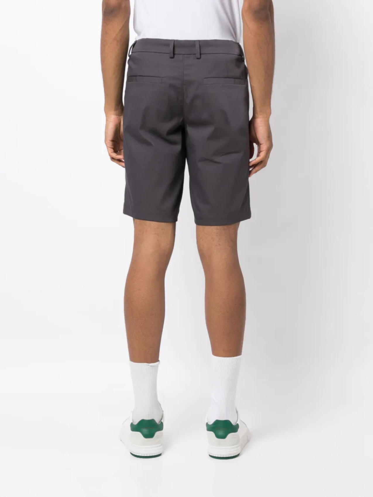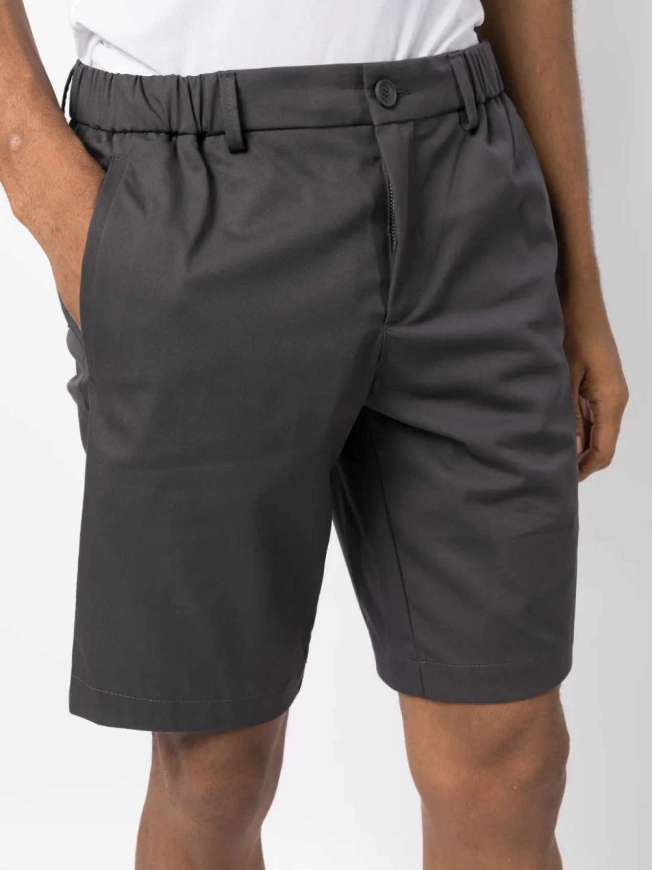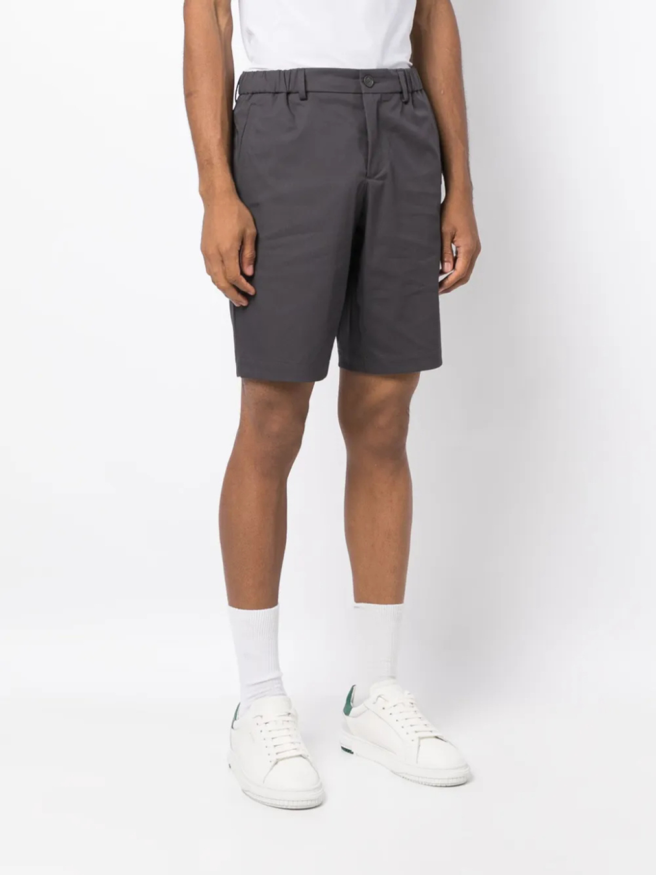 Темно-серый, эластичный хлопок, нашивка с логотипом сзади, петли для ремня, эластичные боковые вставки, длина выше колена, два передних кармана с листочкой, два кармана с листочкой сзади и ширинка на пуговицах.