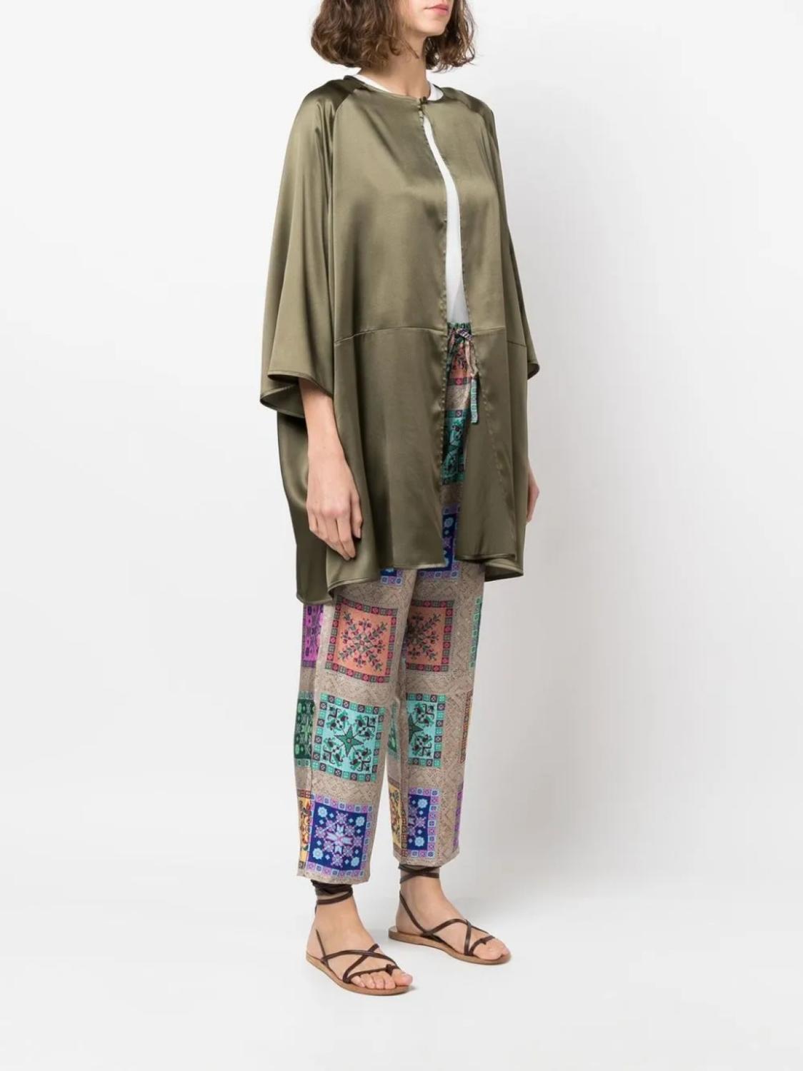 Сатиновый финиш, круглый вырез, застежка на пуговицах спереди, длинные рукава, длина выше колена и прямой подол.