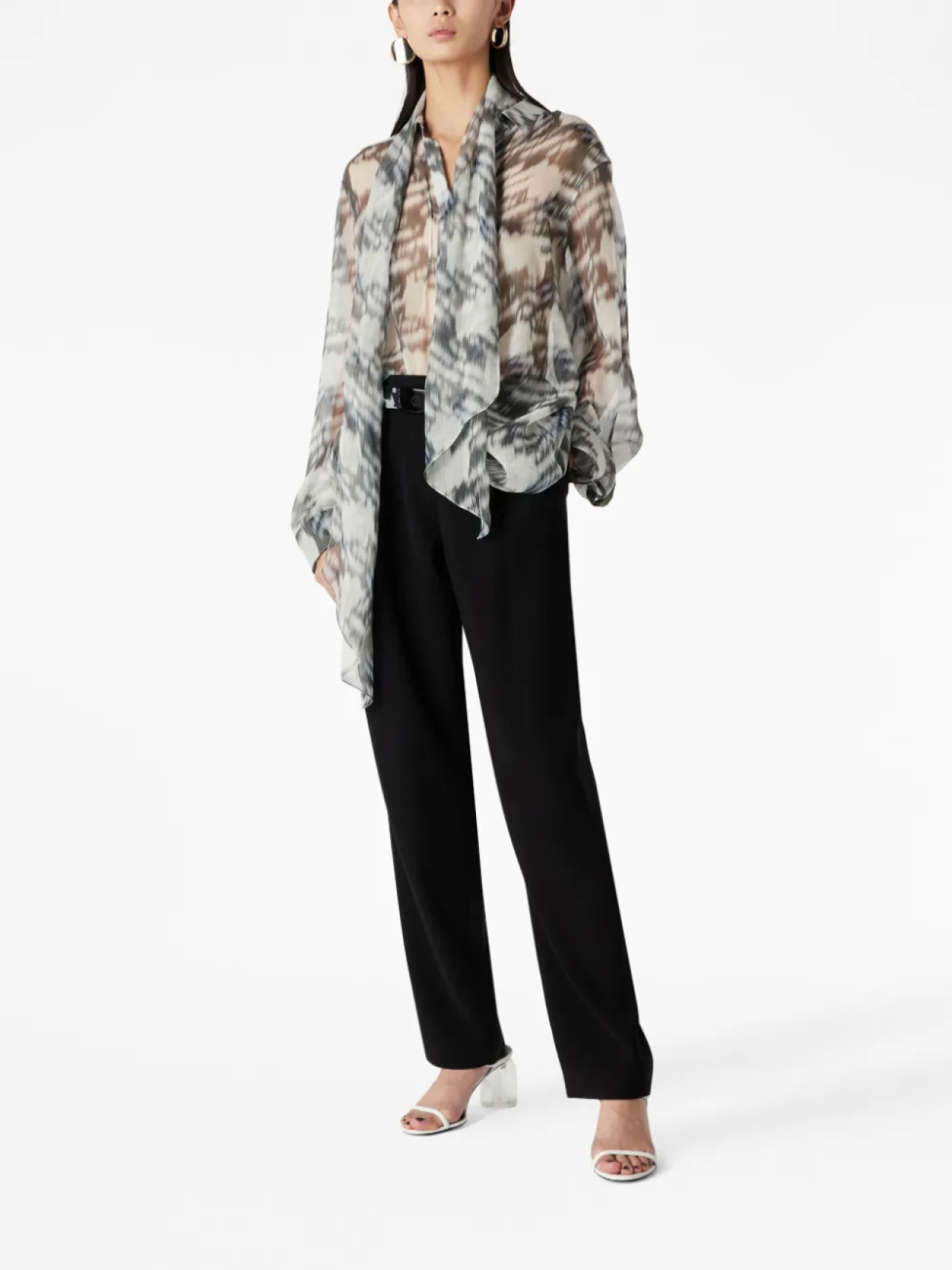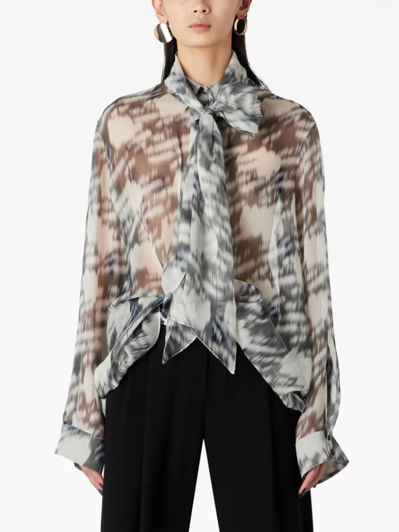 Абстрактный принт, бант, отложной воротник, потайная застежка спереди, длинные рукава, манжеты на пуговицах и закругленный подол.