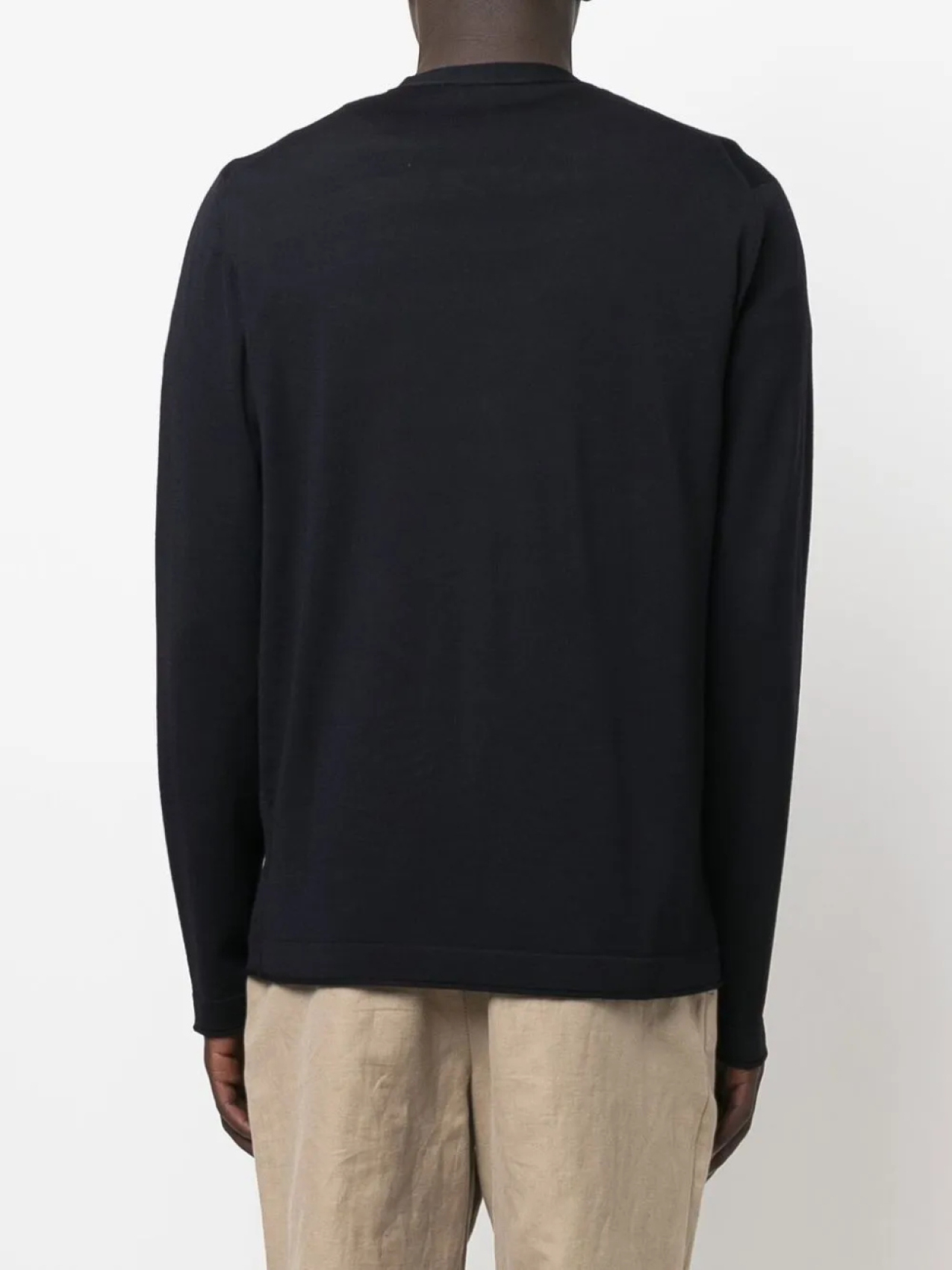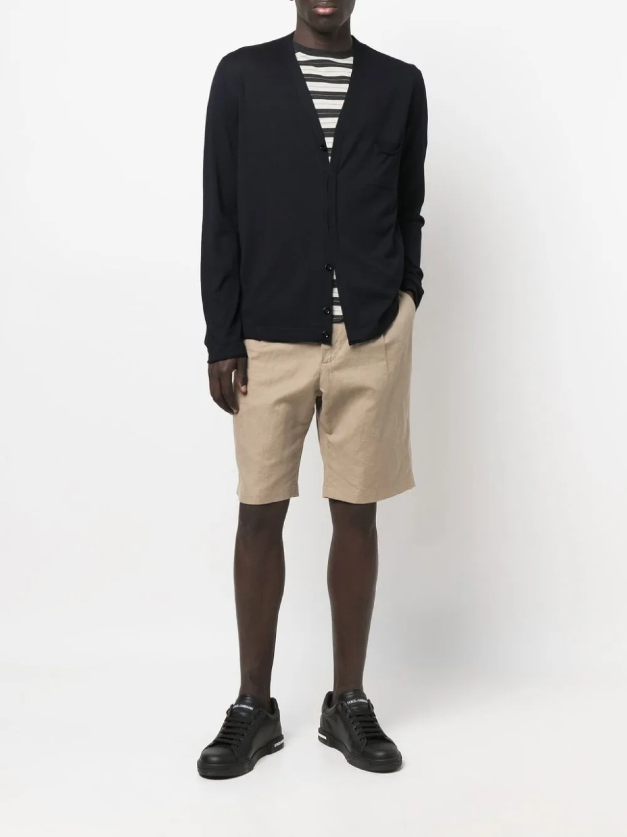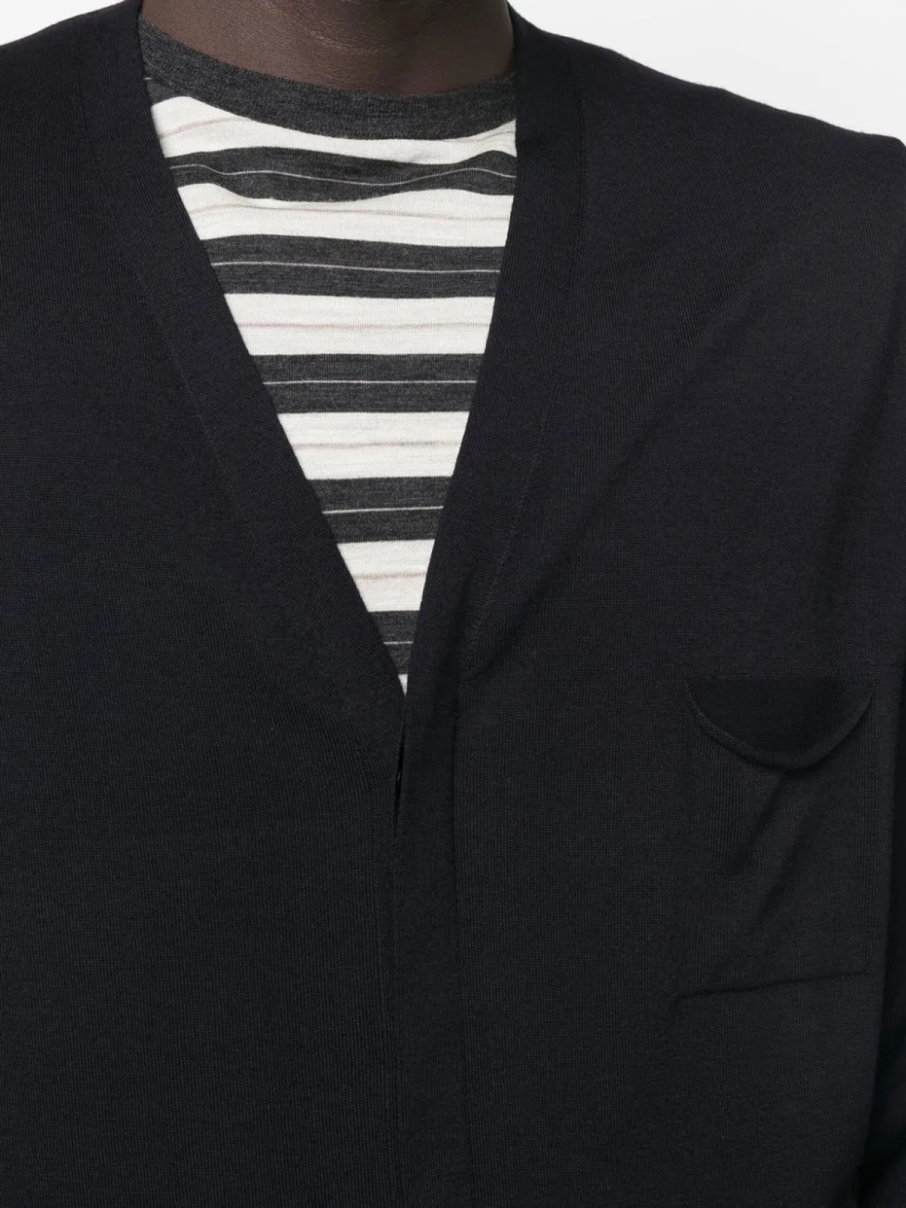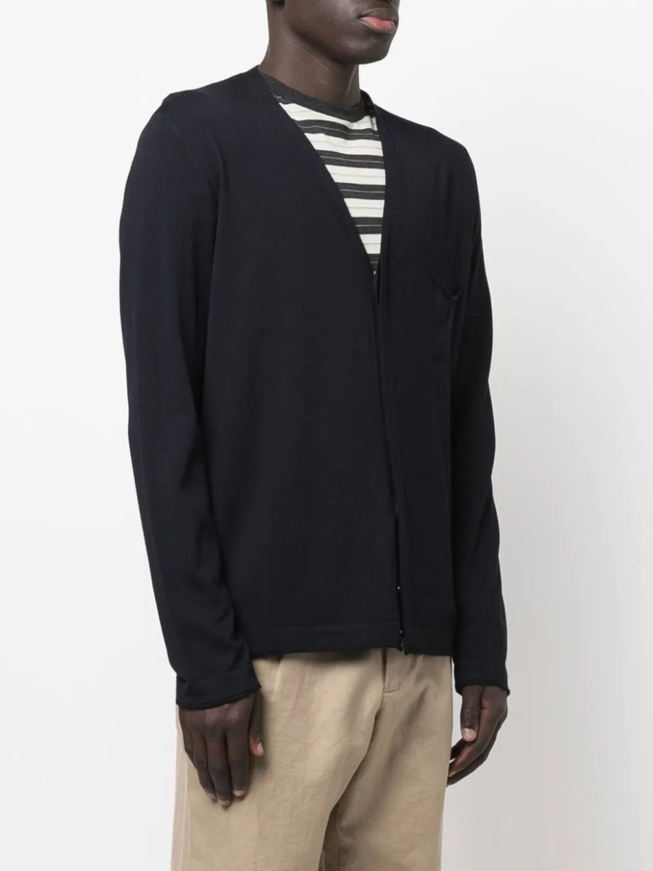 Синий, шерсть мериноса, планка на пуговицах спереди, V-образный вырез, длинные рукава и прямой подол.