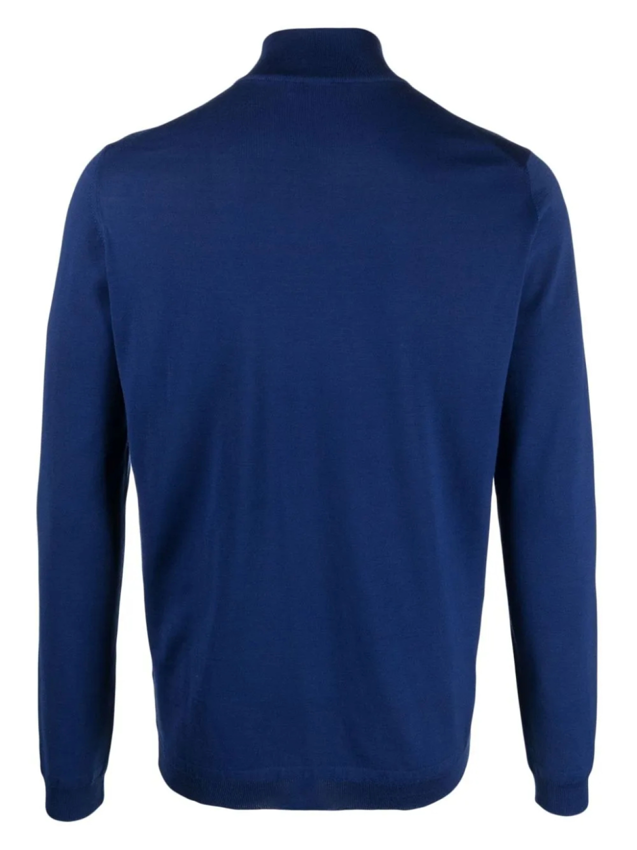 Синий, шерсть мериноса, трикотажный материал, высокий воротник, длинные рукава и прямой подол.
