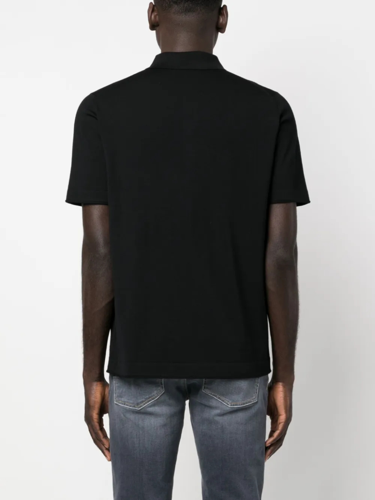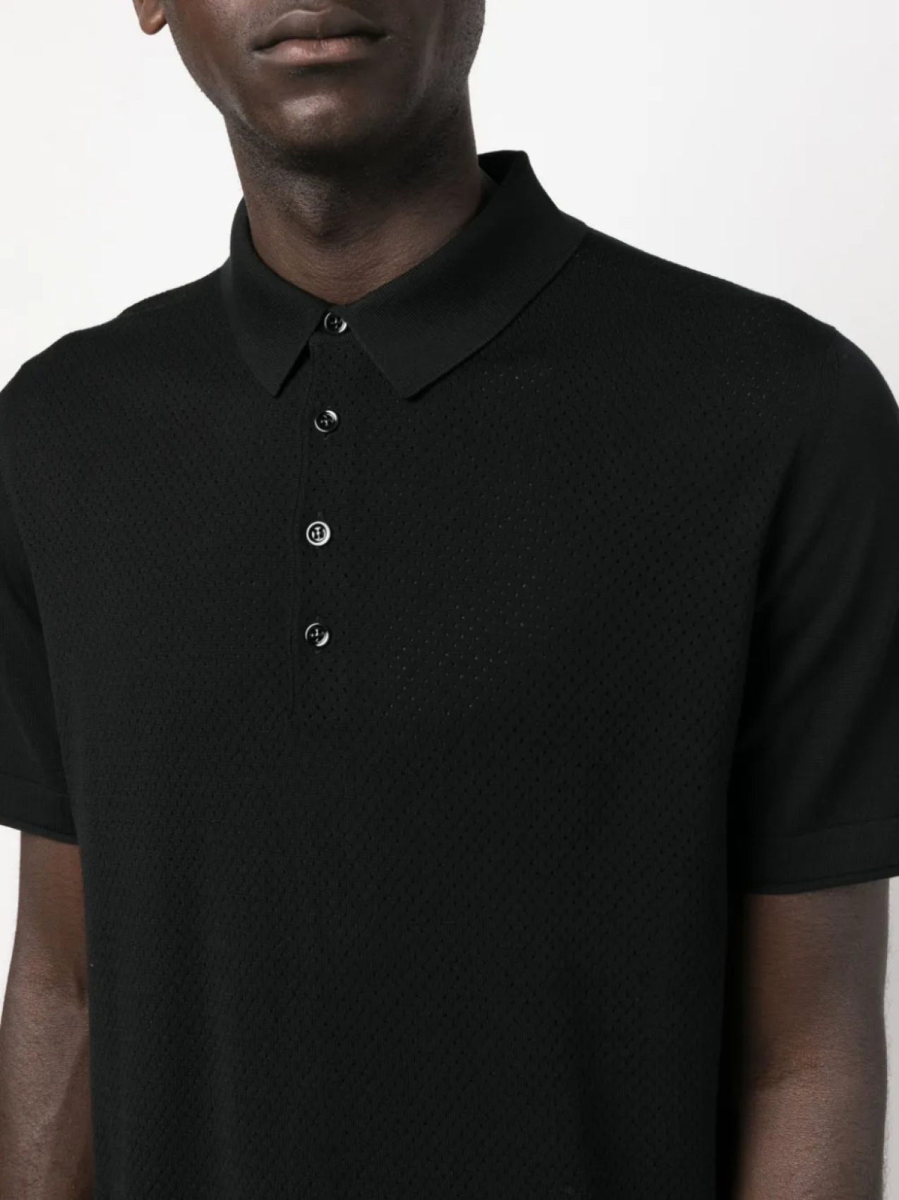 Черный, шерсть мериноса, воротник поло, планка на пуговицах спереди и короткие рукава.