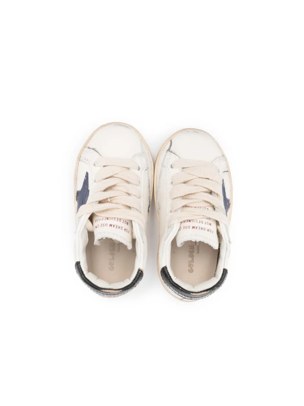 Кремовый, темно-синий, телячья кожа, принт с изображением звезд, язычок с логотипом, принт с логотипом сзади, боковые вставки с логотипом, логотип на подошве, шнуровка спереди, закругленный носок, стелька с логотипом и плоская резиновая подошва.