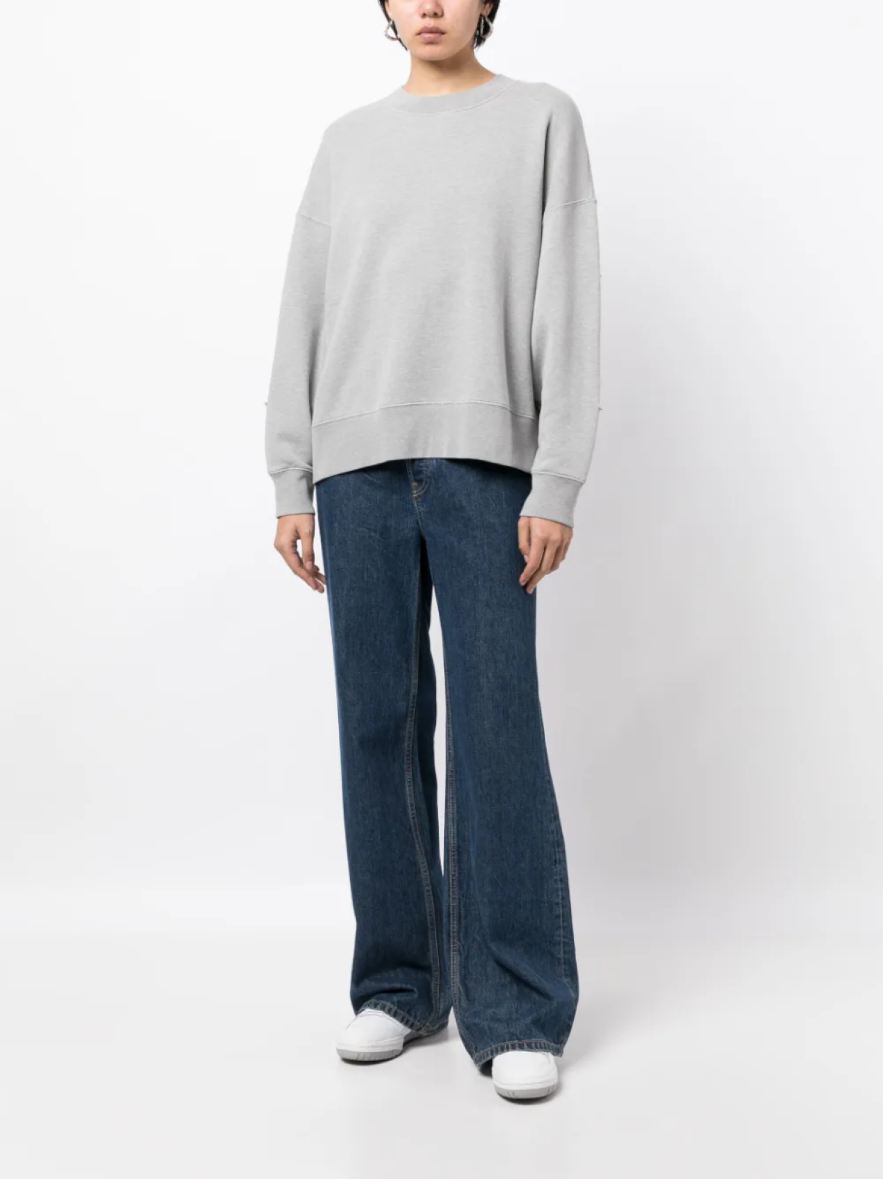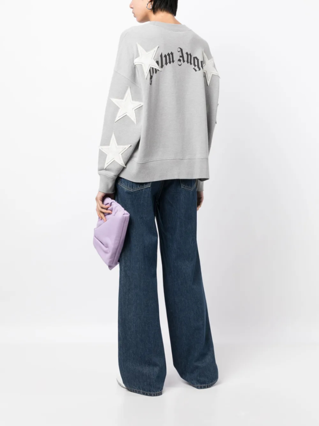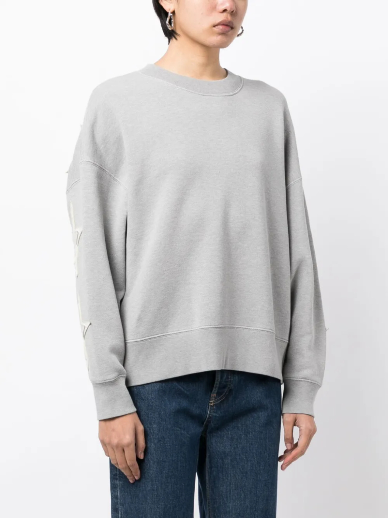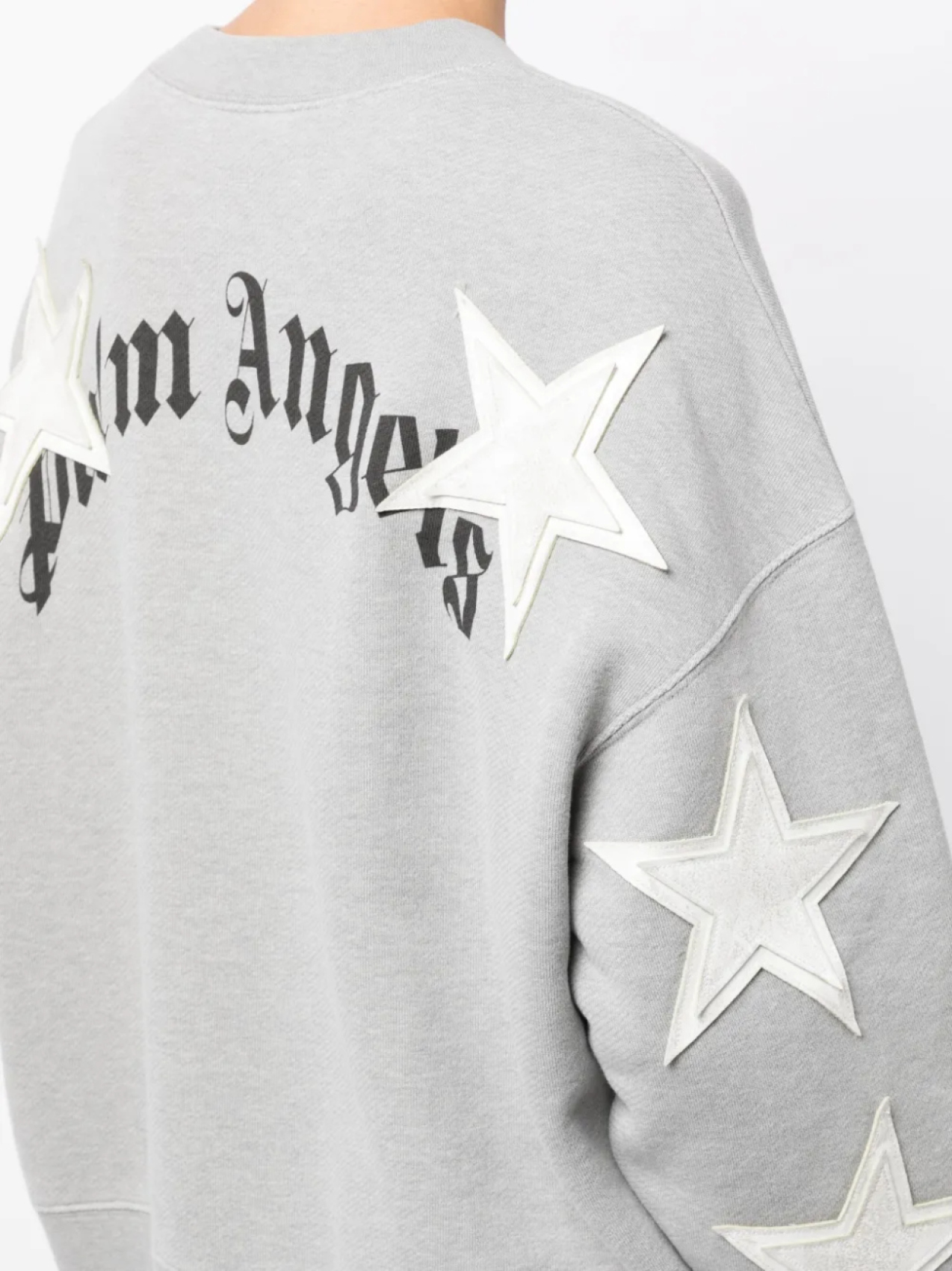 Светло-серый, хлопок, нашивка в форме звезды, принт с логотипом сзади, отделка в рубчик, круглый вырез, приспущенные плечи, длинные рукава и прямой подол.