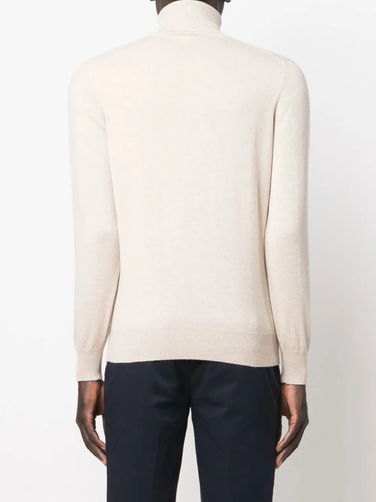 Бежевый, кашемир, высокий воротник, тонкая вязка, длинные рукава и подол в рубчик.