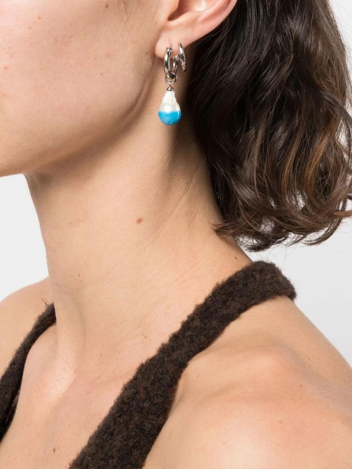 Булавочная застежка, кольца скульптурной формы, детали с жемчугом и для проколотых ушей. В комплект входят две серьги.