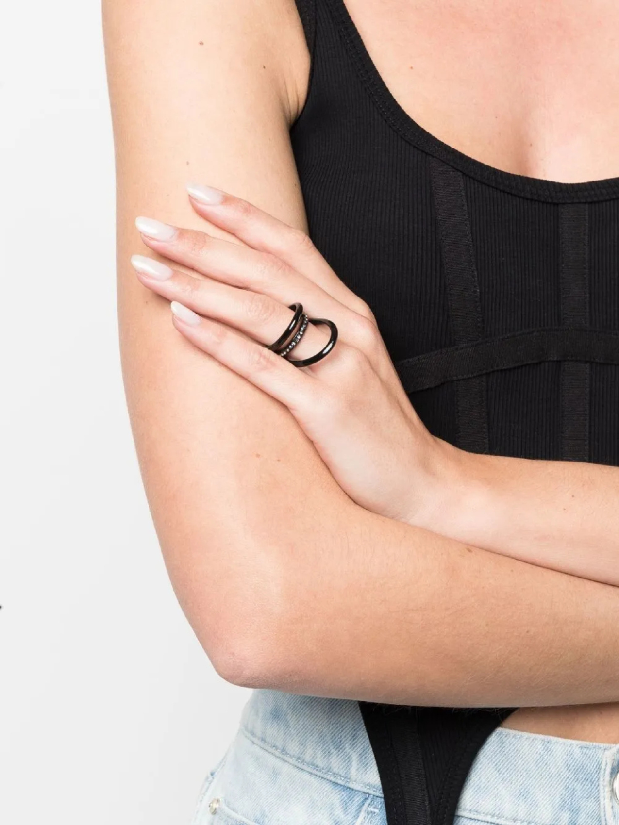 Несколько объединенных колец, декор из кристаллов, закрепка паве и глянцевая фактура. Цвет: черный.