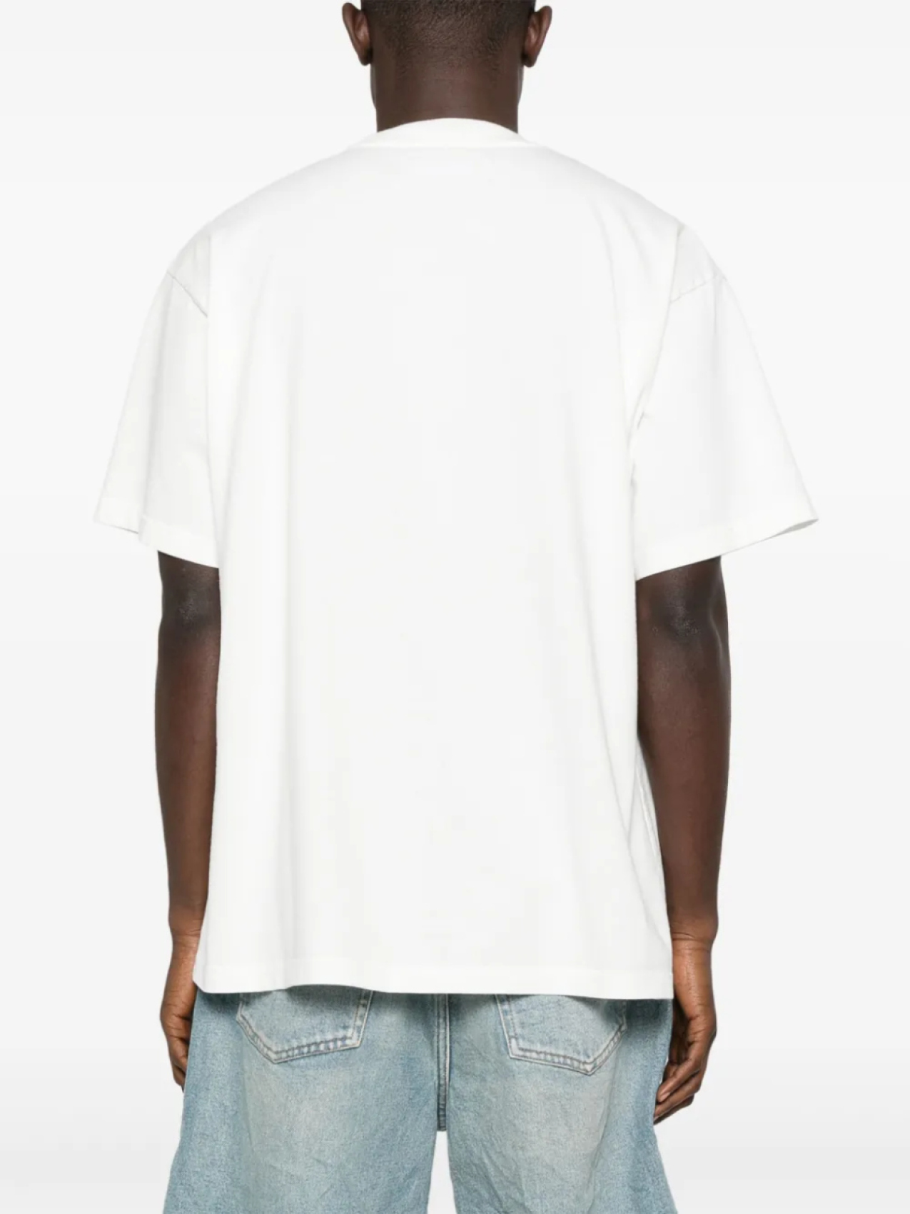 Белый круглый вырез, спущенное плечо, короткие рукава, прямой подол