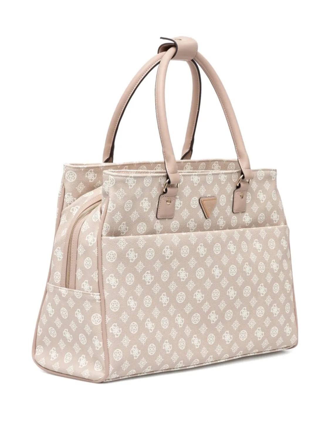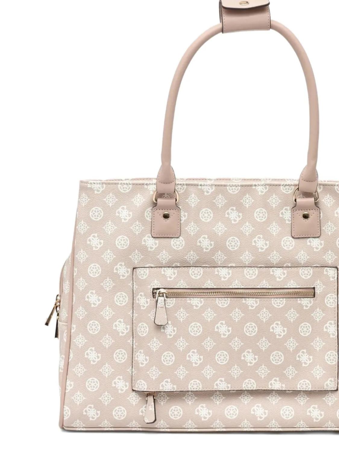 Бежевый узор с монограммой, застежка-молния сверху, две длинные верхние ручки, карман на молнии сзади