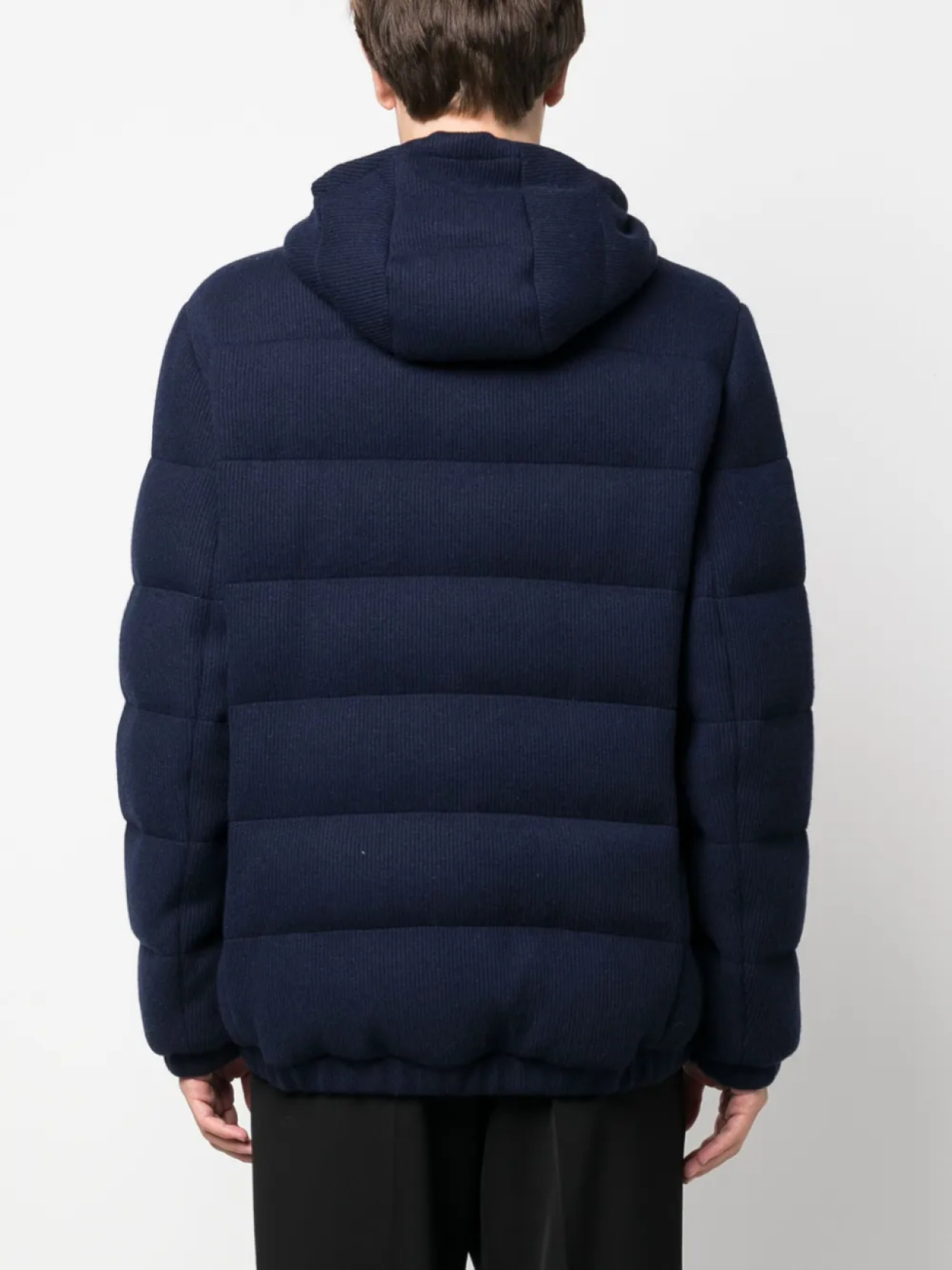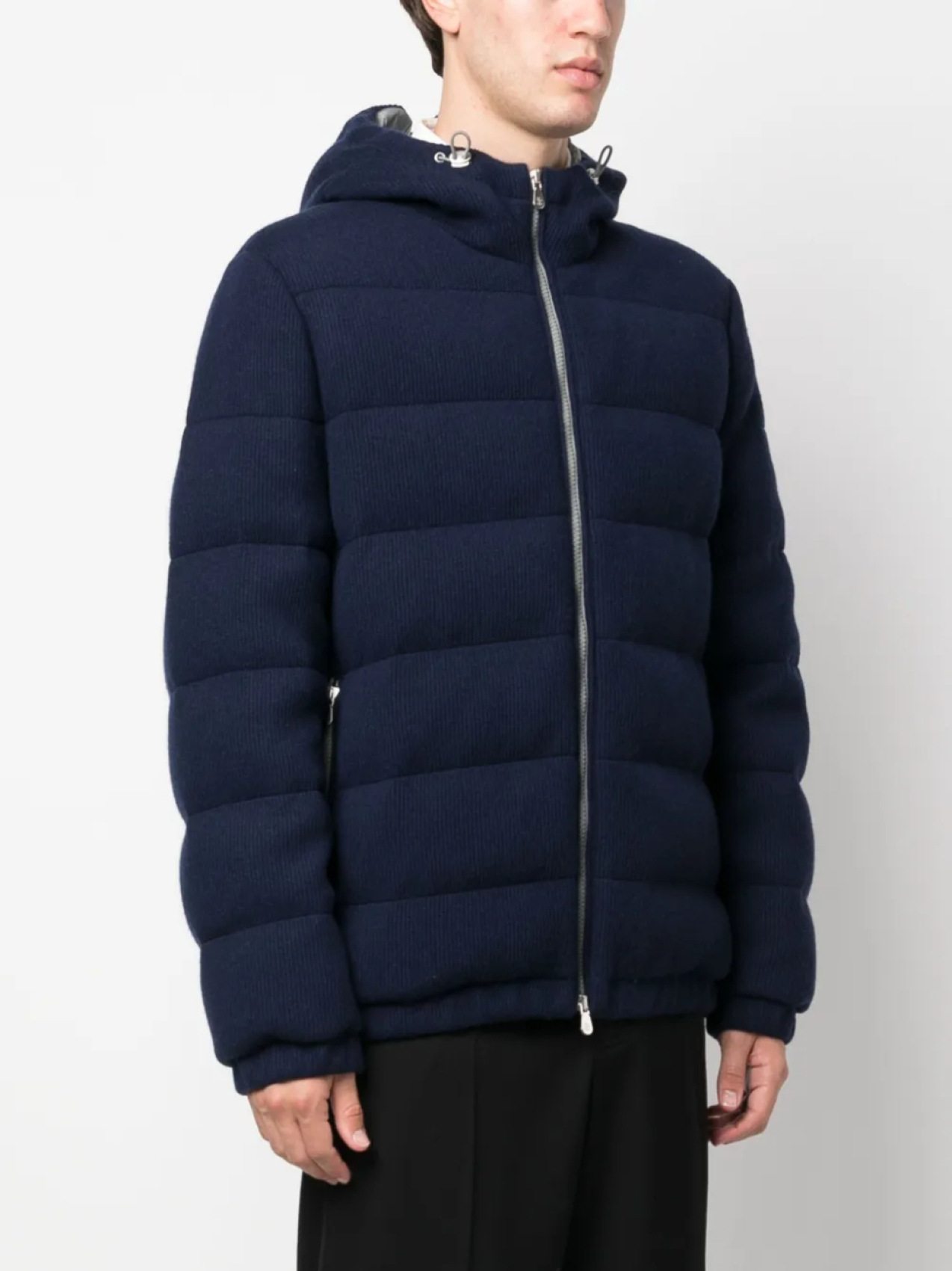 Темно-синий, кашемир, гусиный пух, дутый материал, затягивающийся на шнурок капюшон, двусторонняя молния спереди, длинные рукава, два кармана на молнии по бокам и прямой подол.