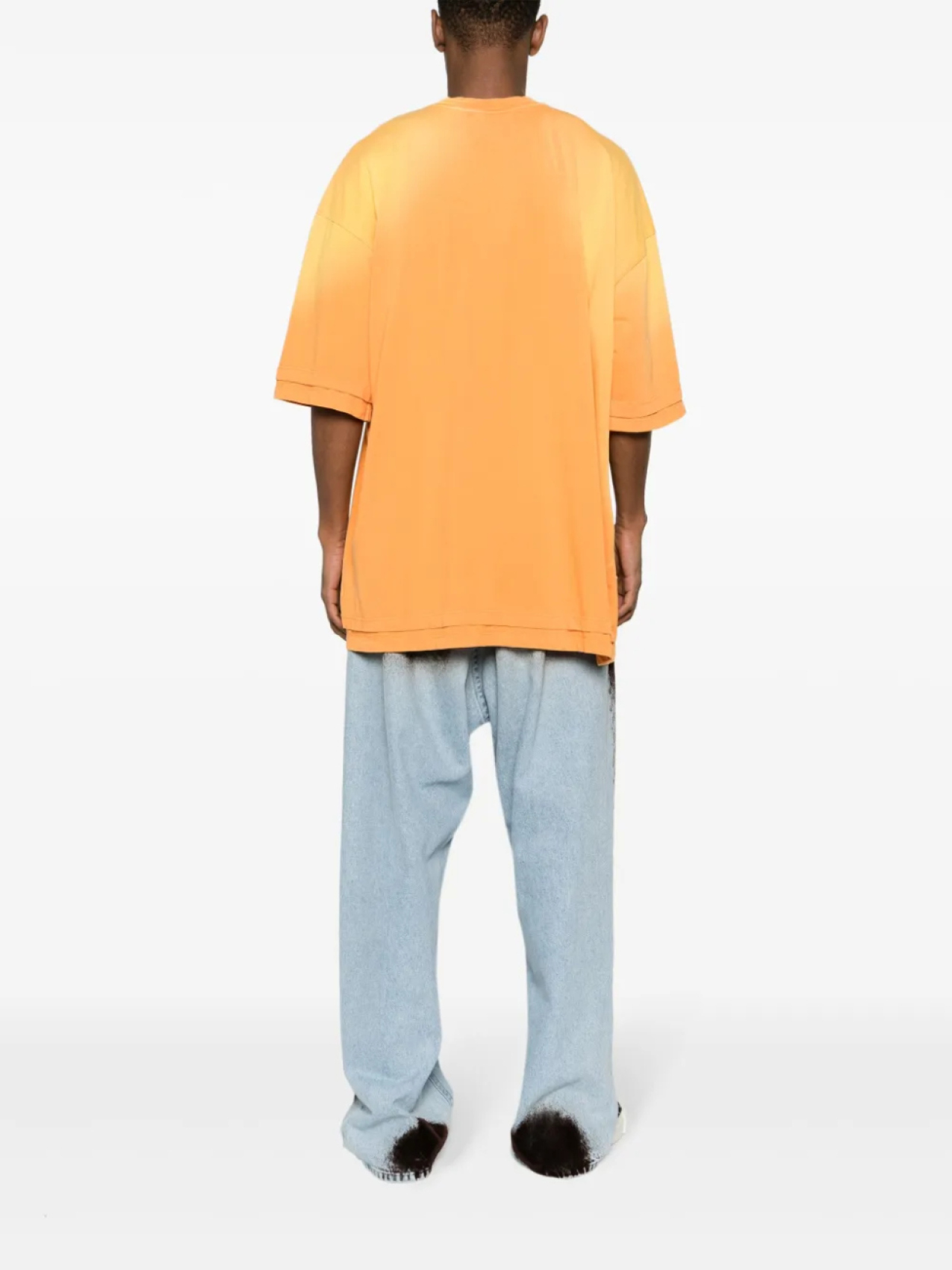 Янтарно-оранжевый, хлопок, вышитый логотип спереди, приспущенные плечи, круглый вырез, короткие рукава и прямой подол.