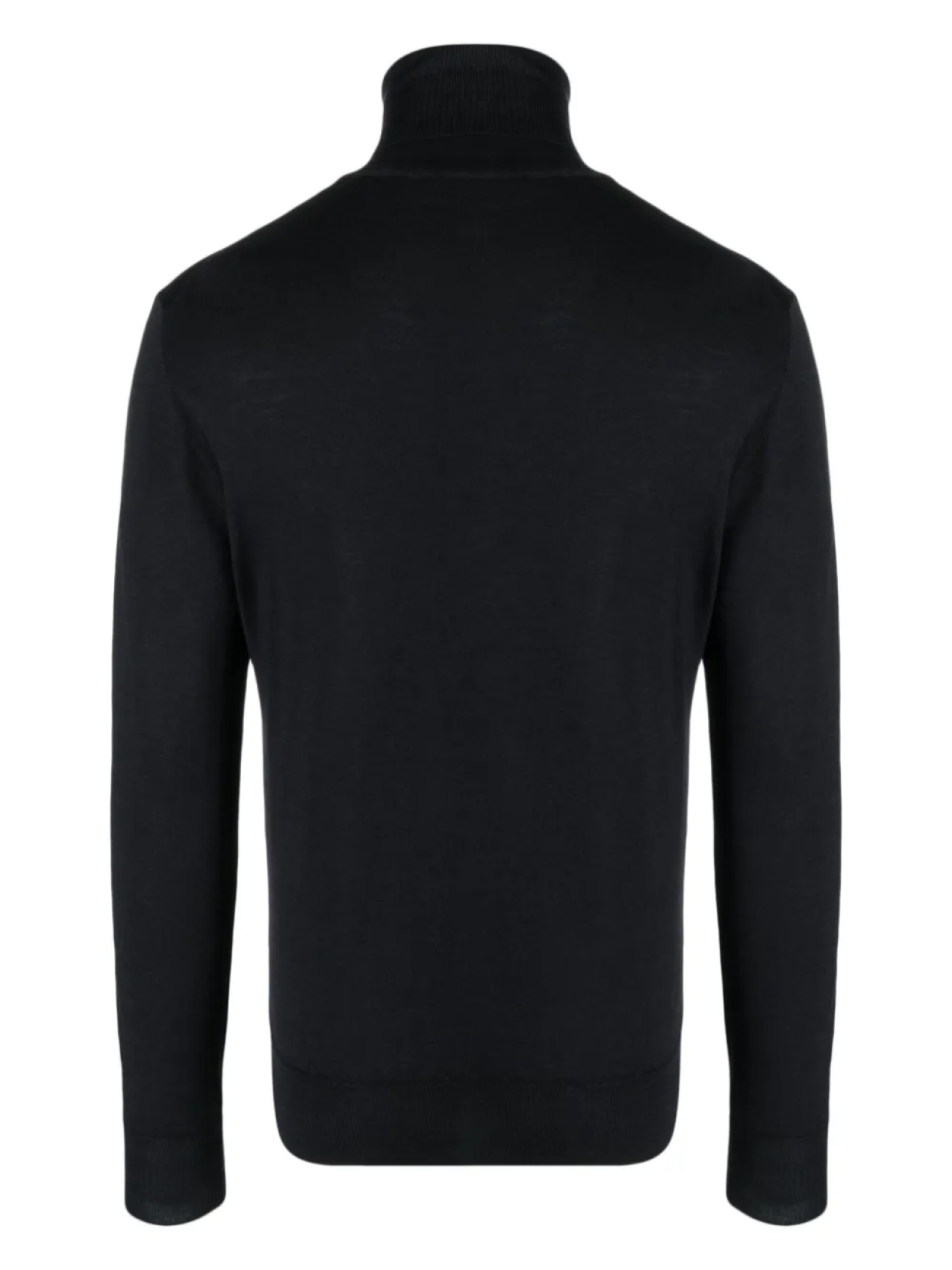 Черный, необработанная шерсть, тонкая вязка, высокий воротник и длинные рукава.