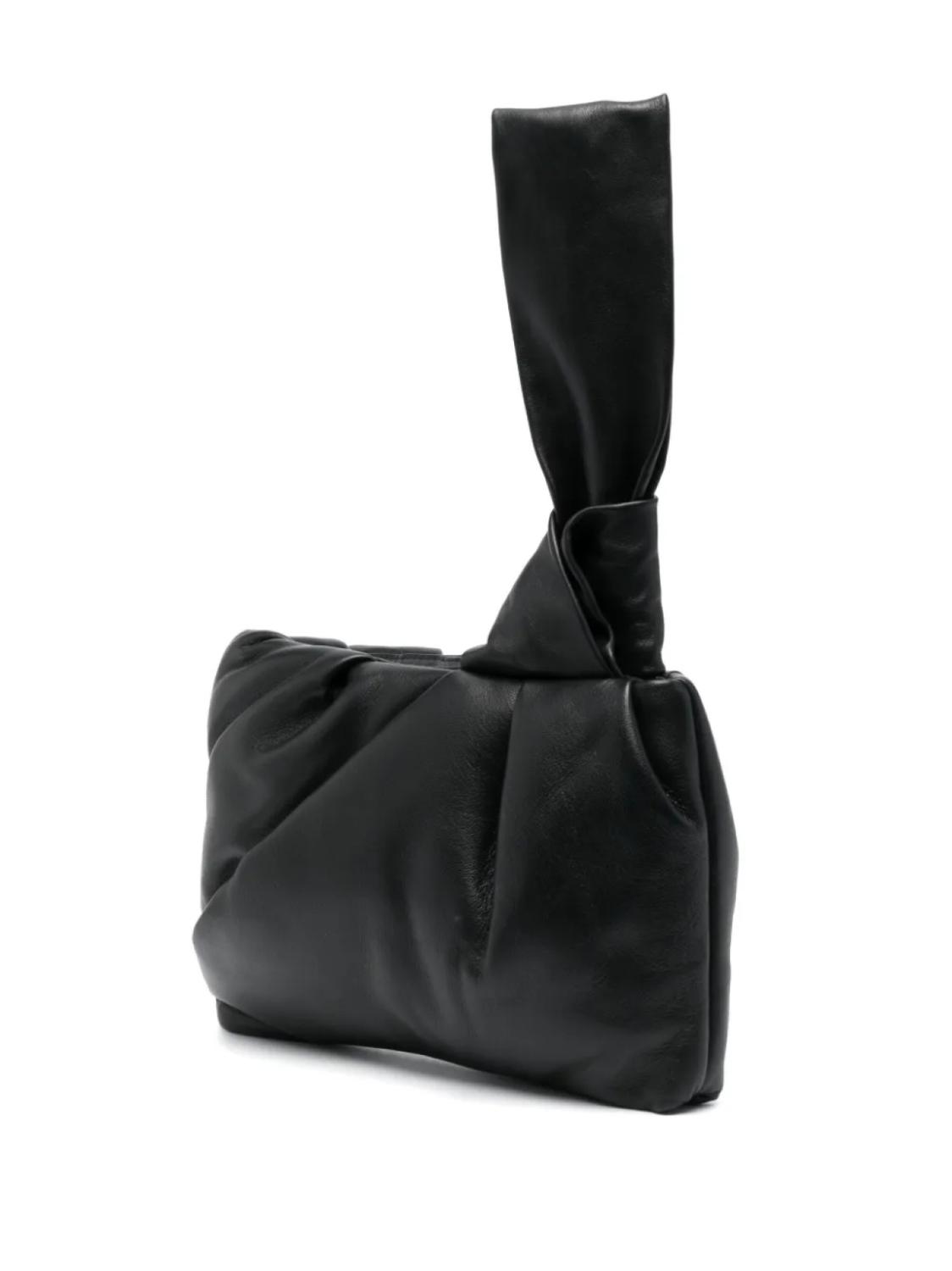 Черный, кожа наппа, детали с оборками, декор в виде узла, ремешок на запястье, потайная застежка на молнии сверху и основное отделение.