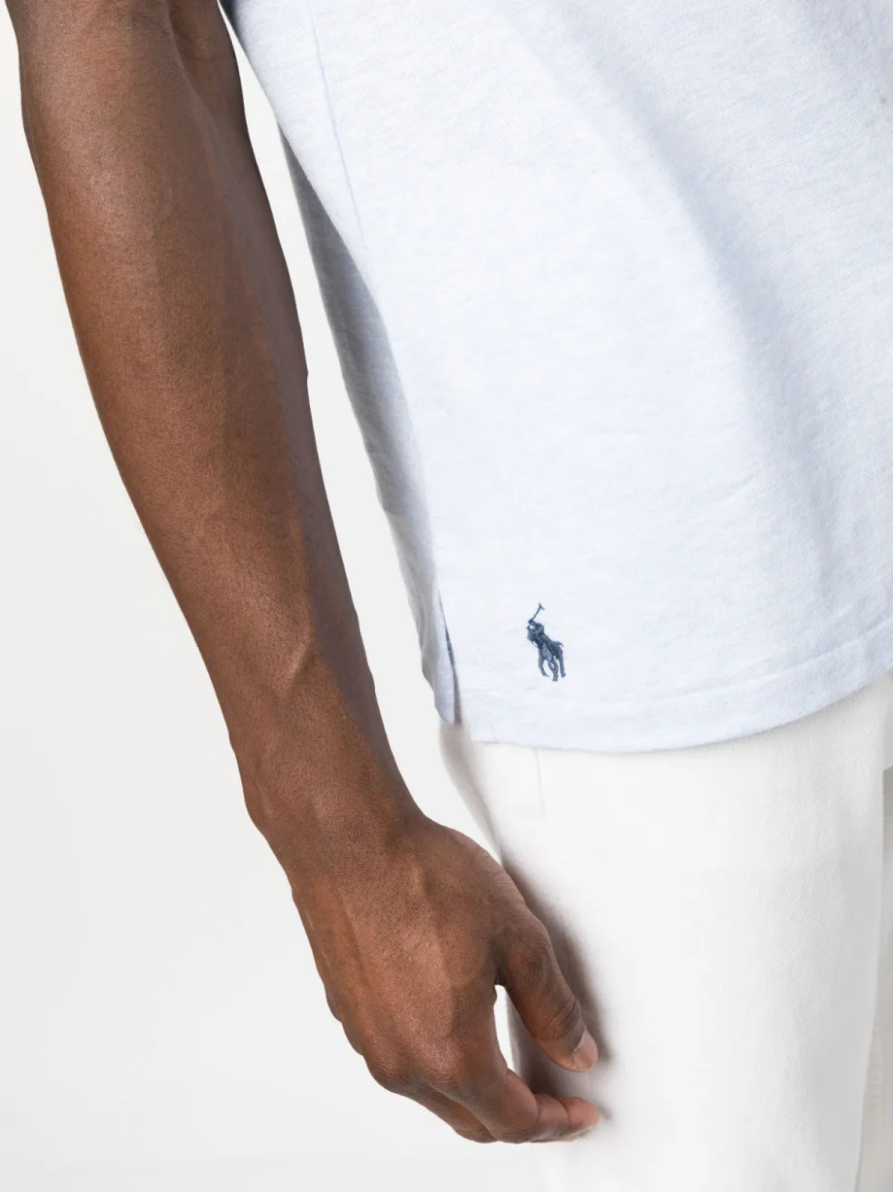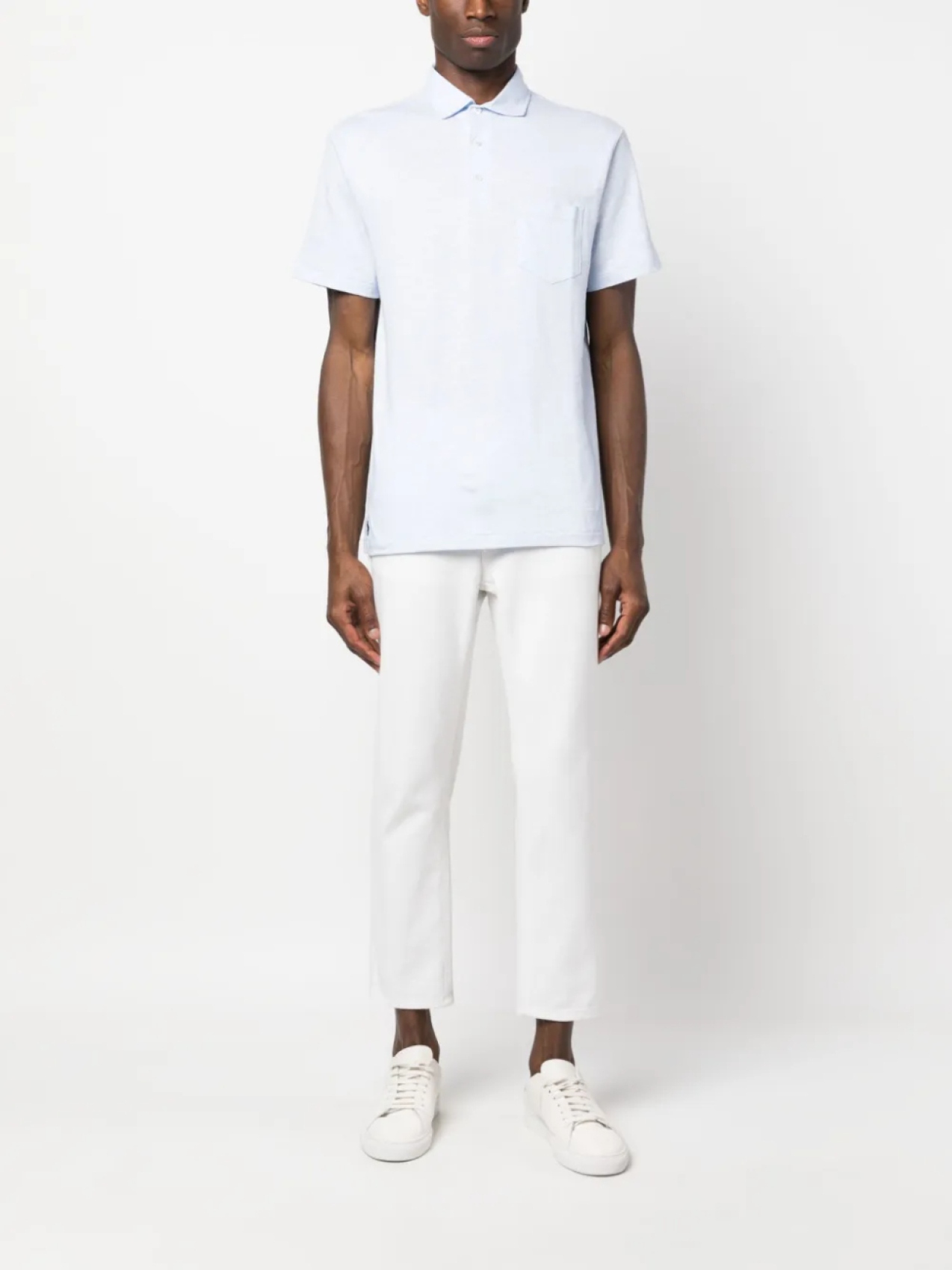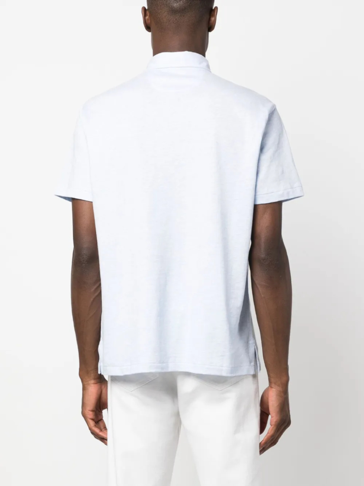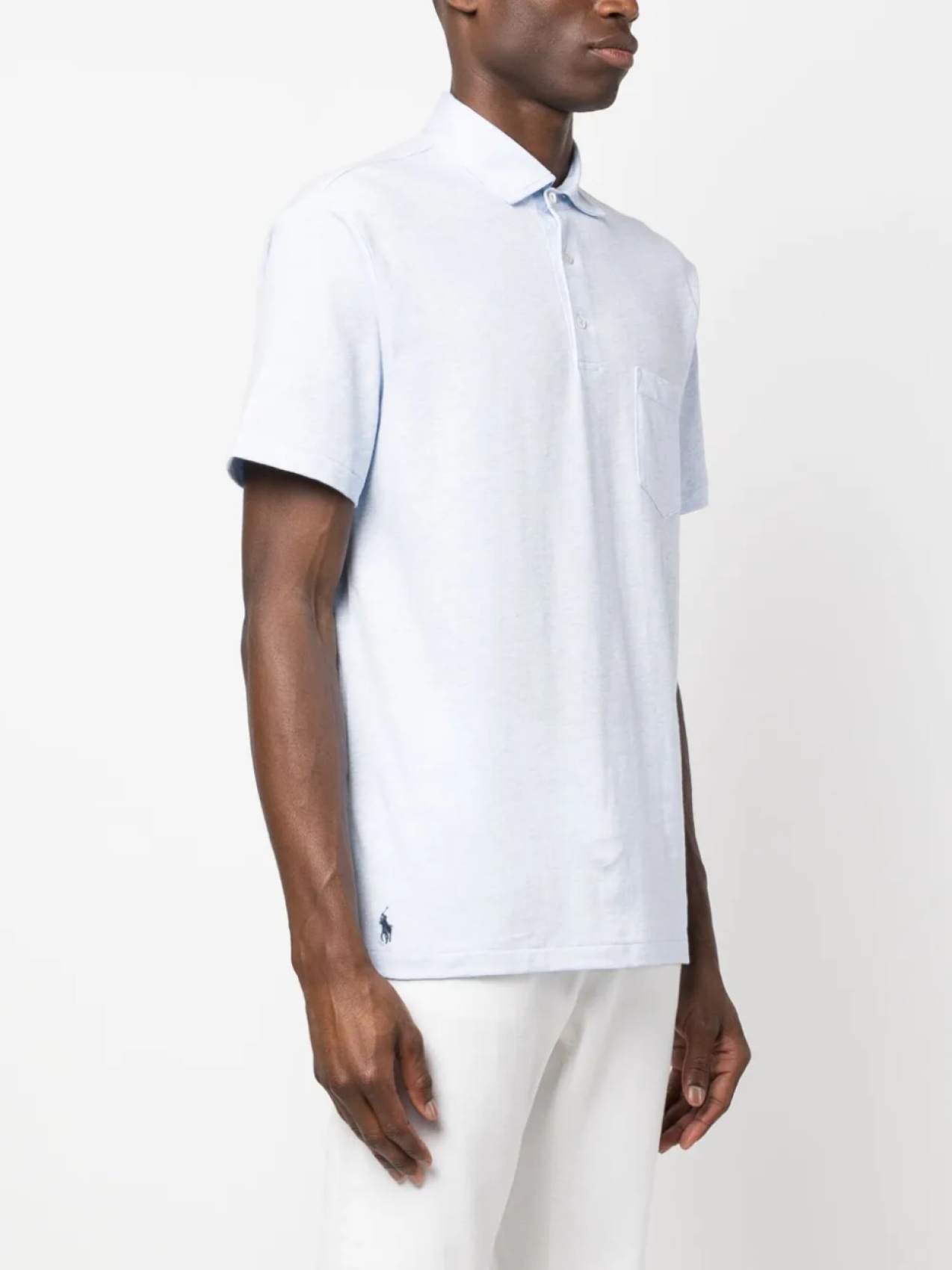Голубой, смесь хлопка и льна, вышитый логотип, воротник поло, короткие рукава, короткая застежка на пуговицах спереди, нагрудный накладной карман и прямой подол.