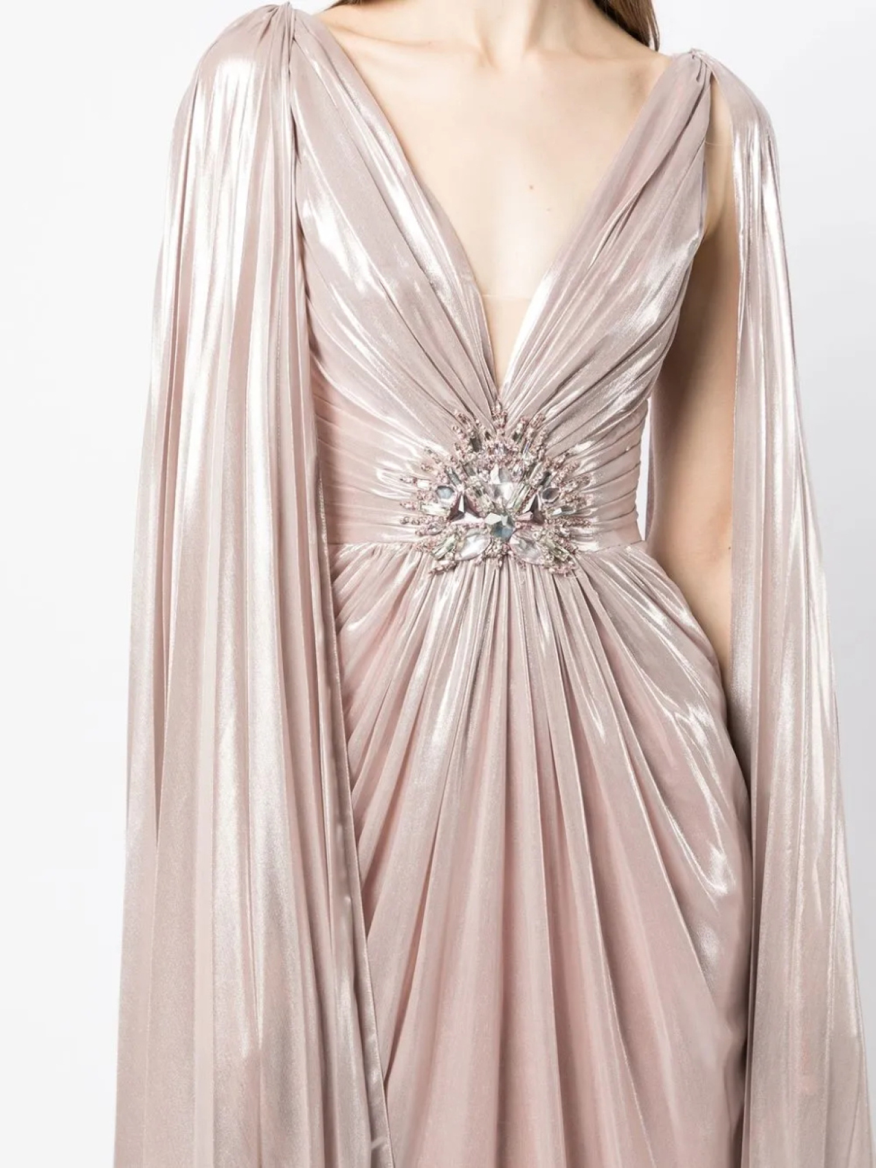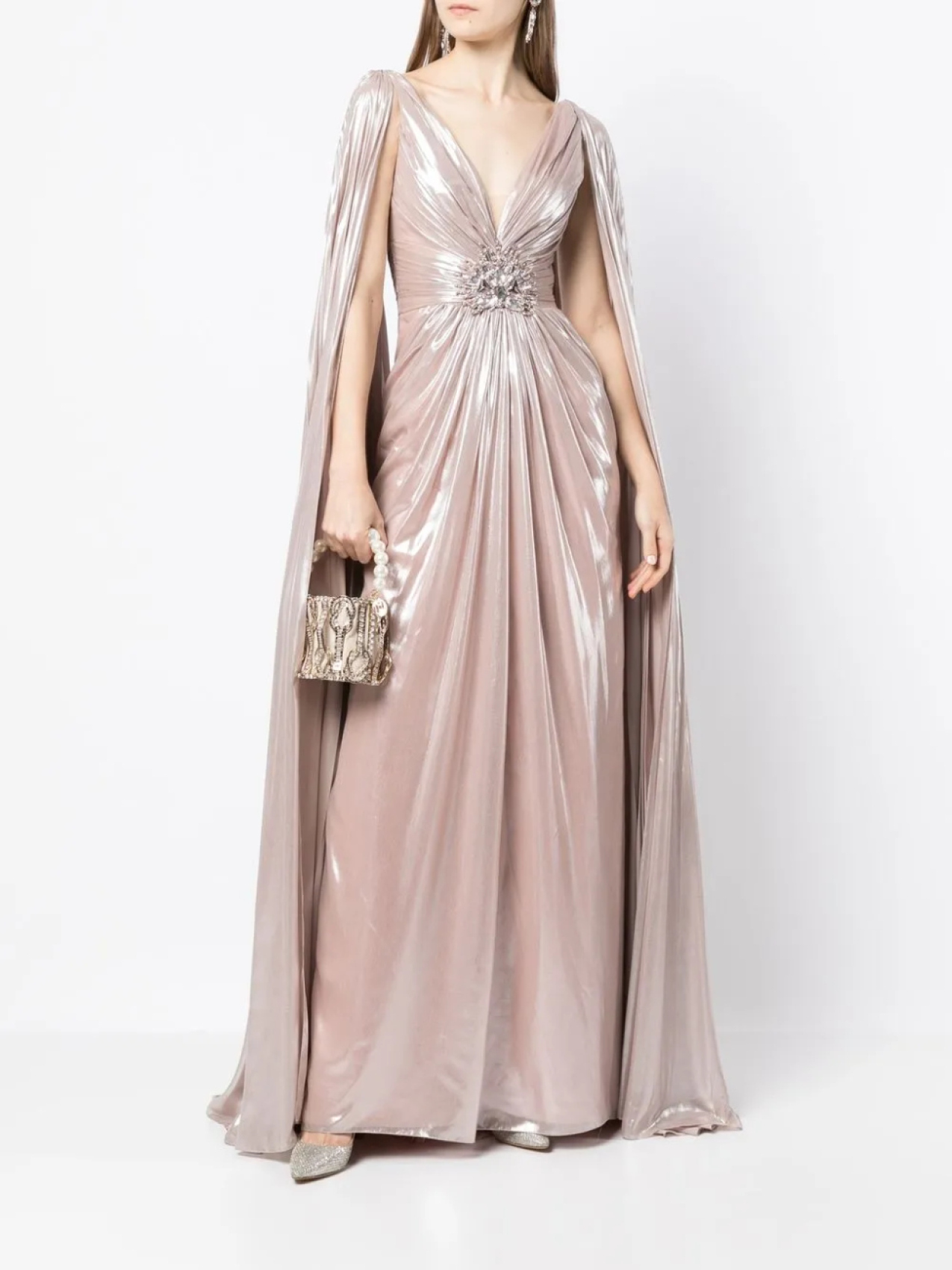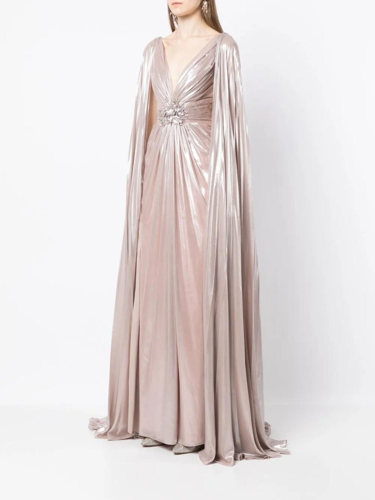 Розовый, лакированное покрытие, декор из кристаллов, дизайн со сборками, глубокий V-образный вырез, кейп, длинные рукава, складки, А-образный силуэт, V-образный вырез сзади, длина макси и шлейф.